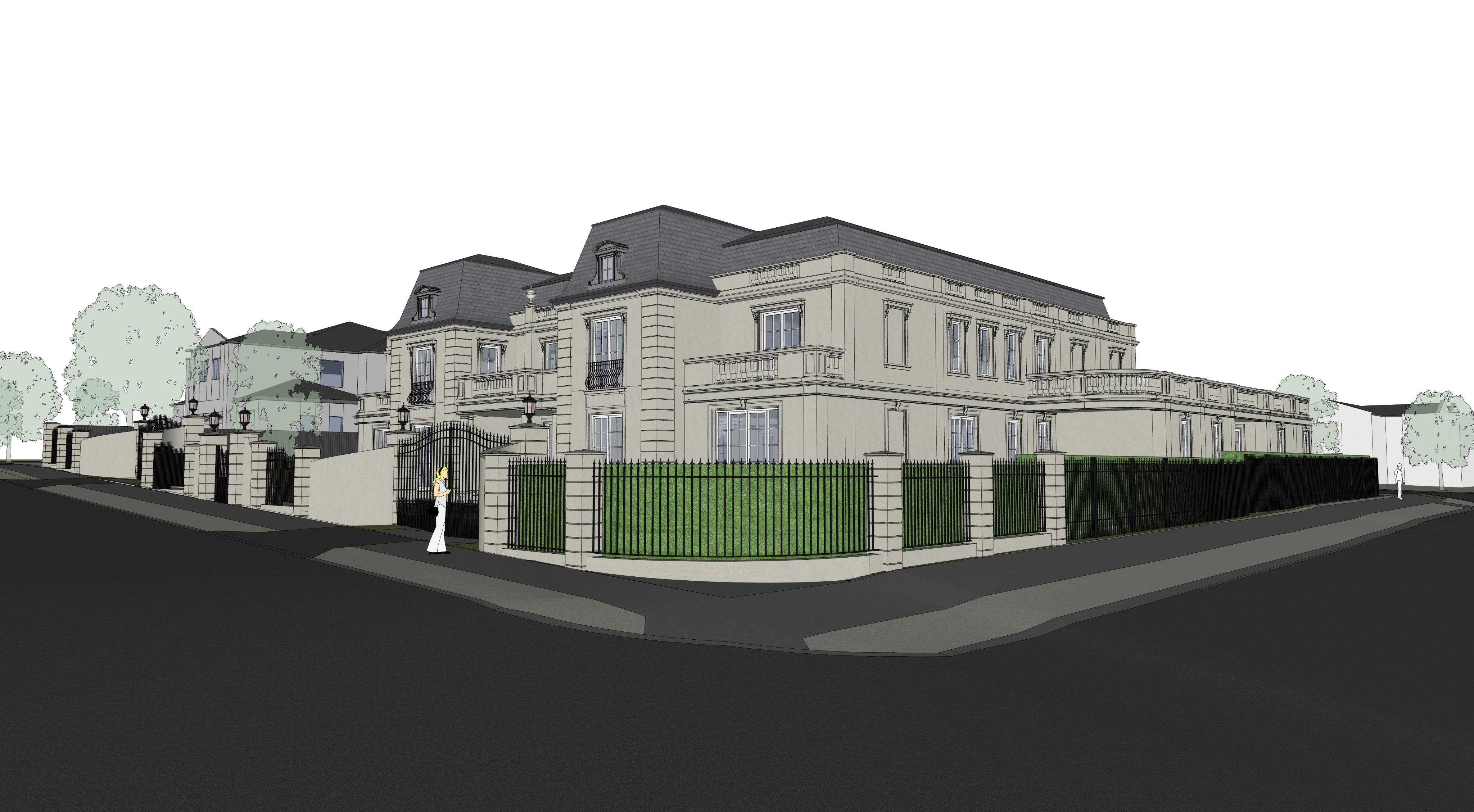 photo realistic render classical home high green hedges fence dramatic lighting award winning overcast slate roofing wet road