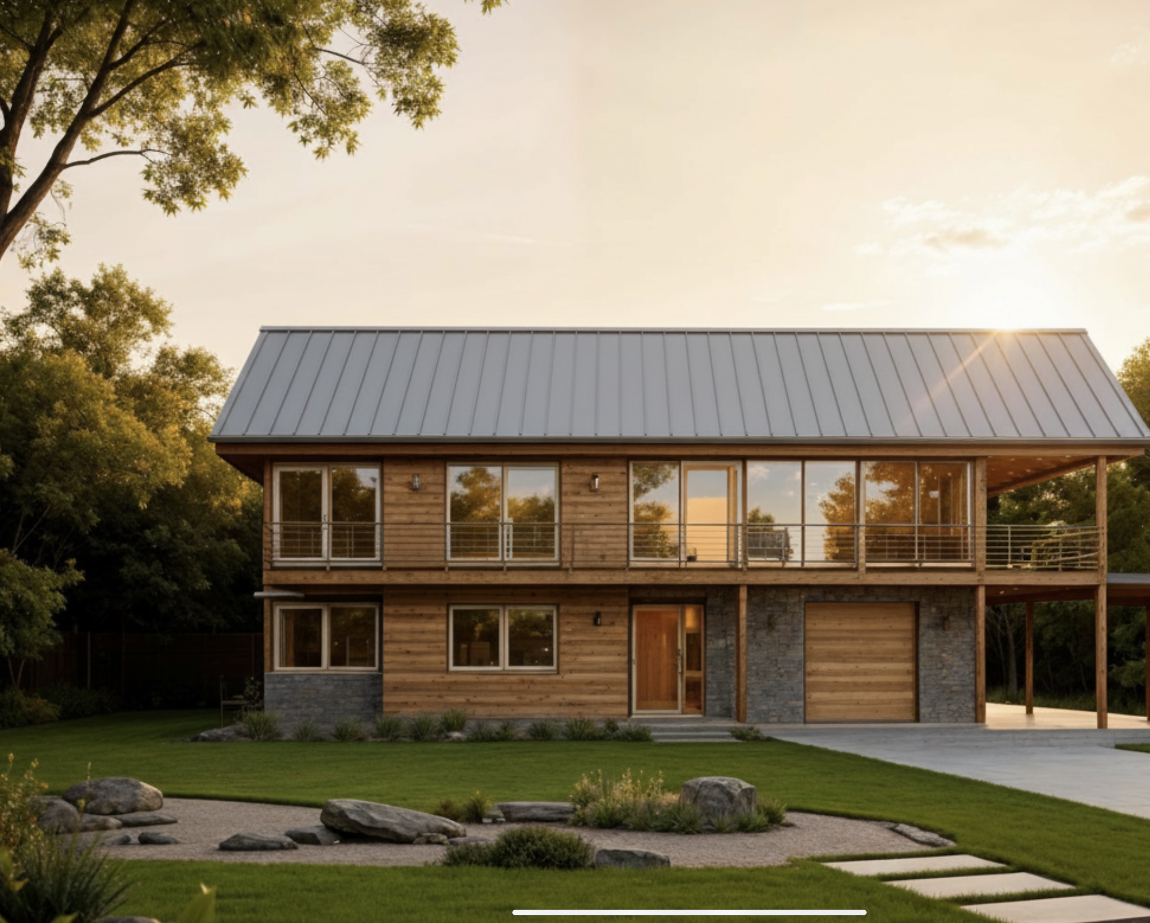 refine this house adding more columns to hold up the front deck make the grey stone more natural