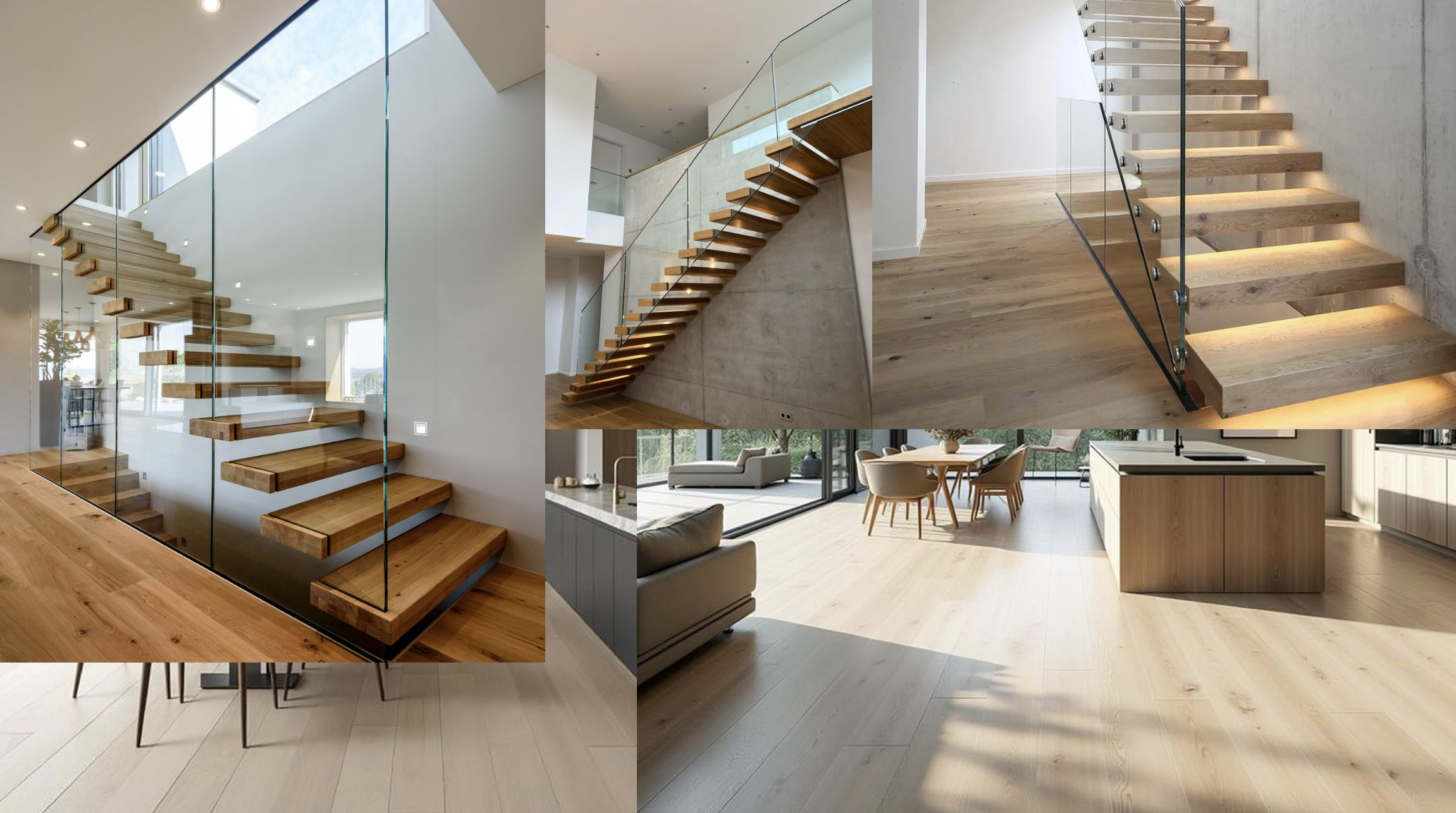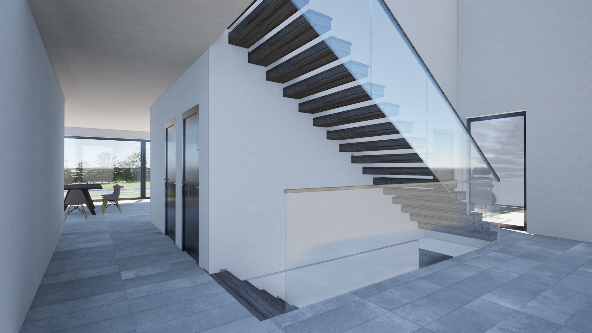 exterior shot render a modern interior with a floating staircase the stairs are brown wood with clear glass railings creating a sleek airy look the flooring is light timber complementing soft white walls large windows allow natural light to flood in enhancing the spacious feel outside a lush green garden contrasts with the interior s neutral tones add an atmosphere of tranquility and minimalist elegance
