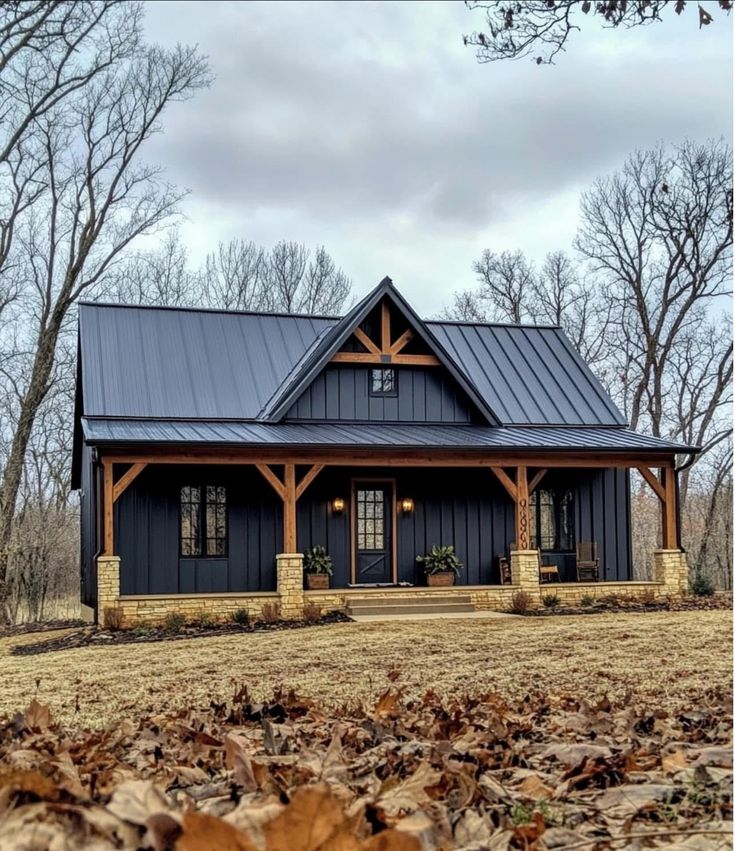 modernist exterior shot create a stunning digital rendering of a modern farmhouse set during golden hour the house features a shinny sleek dark blue metal exterior contrasted by warm natural wood accents on the porch and window frames the roof is a dark shinny metal the surrounding landscape includes a vibrant green lawn with subtle autumn foliage along the edges highlighted by the golden hues of the sun the sky is dramatic filled with soft scattered clouds reflecting tones of light gray and orange adding depth and warmth to the scene the overall atmosphere is serene and inviting blending modern architecture with the beauty of nature architecture