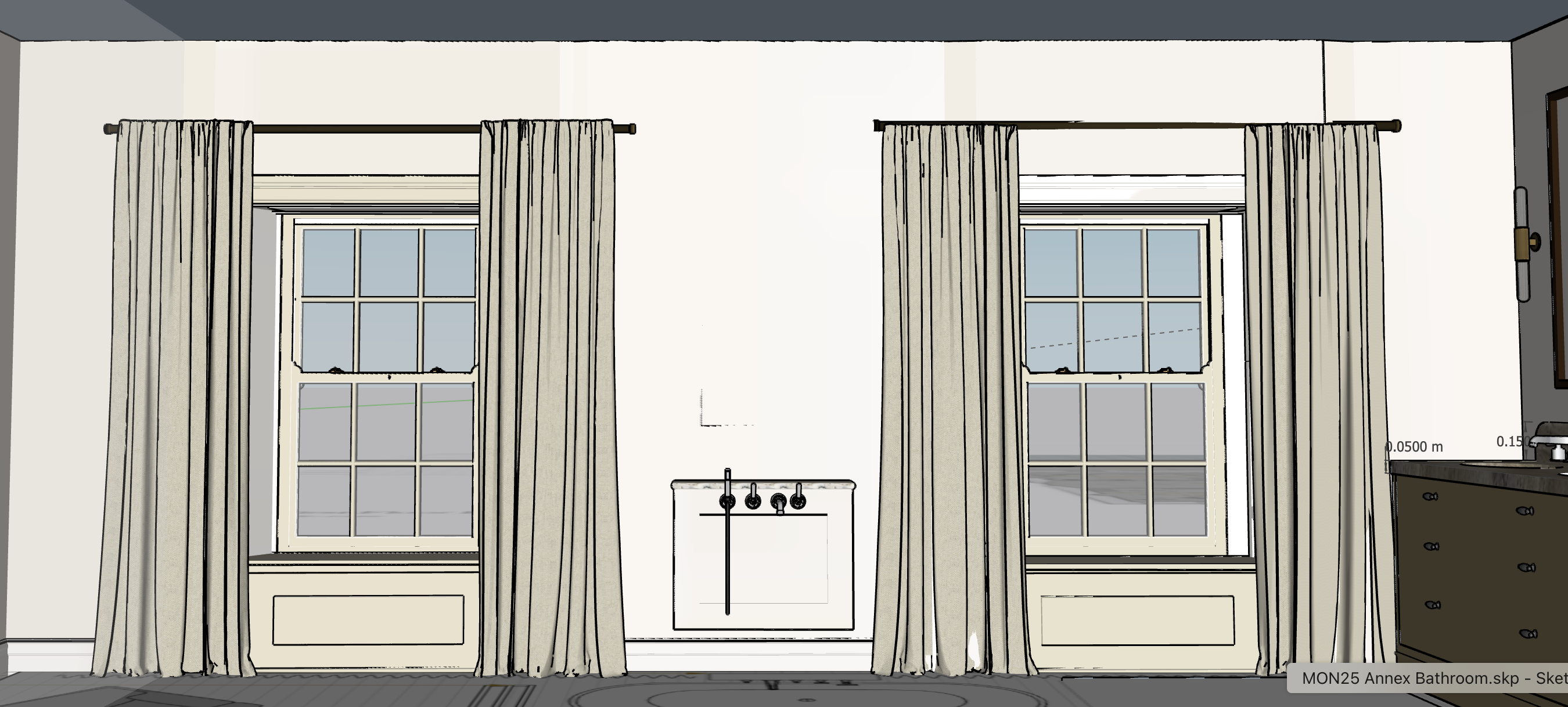 trees and nature outside window neat heavy luxurious light neutral linen curtains bronze curtain pole photorealistic to look it was taken on an slr 35mm camera subtle limewash paint texture on the wall diffused light atmospheric warm natural light coming from window editorial interior photography style elegant natural flattering soft shadows soft satin paint on moulding but limewash on ceiling neutral light not too warm toned rich stain on original pine boards