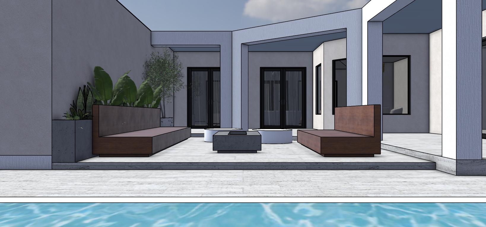 transform this image into a highly realistic modern outdoor patio render preserving the original architecture proportions and camera angles fire pit add black lava stones inside the fire pit and introduce realistic natural flames in the center the fire should look subtle and elegant not exaggerated bench seating add outdoor cushions to both wooden bench sofas on each side use light neutral fabric off white sand beige realistic outdoor textile with soft folds and natural wear integrated lighting add recessed led lighting underneath both bench sofas and underneath the fire pit creating a floating effect use warm light at 2500k very soft indirect and not too intense round seats replace the two round seats with modern woven wicker poufs natural tone suitable for outdoor use cohesive with the patio design plants replace the background plants with modern varied landscaping avoiding repetition use a mix of contemporary outdoor plants that complement a minimalist luxury patio overall look ultra realistic materials accurate shadows natural reflections soft ambient lighting modern luxury outdoor atmosphere