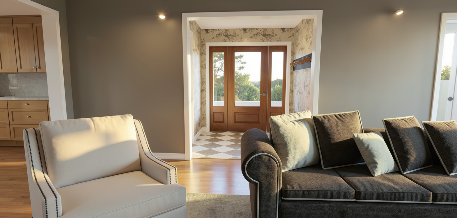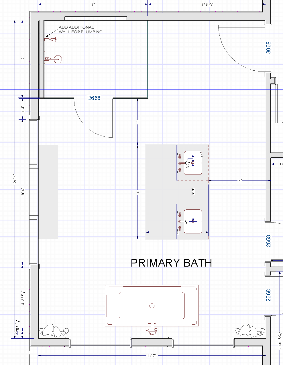 convert this floor plan into a realistic isometric 3d view of a bathroom show the space from an elevated angle with furniture walls and details visible primary bathroom floor will be akdo primal in color sand 12z24 shower floor will be that color but 2x2 tile countertop will be seal pearl quartzite no shower bench shower head will only be on left wall use the same furniture as shows on the plan do not change the orientation of the floorplan