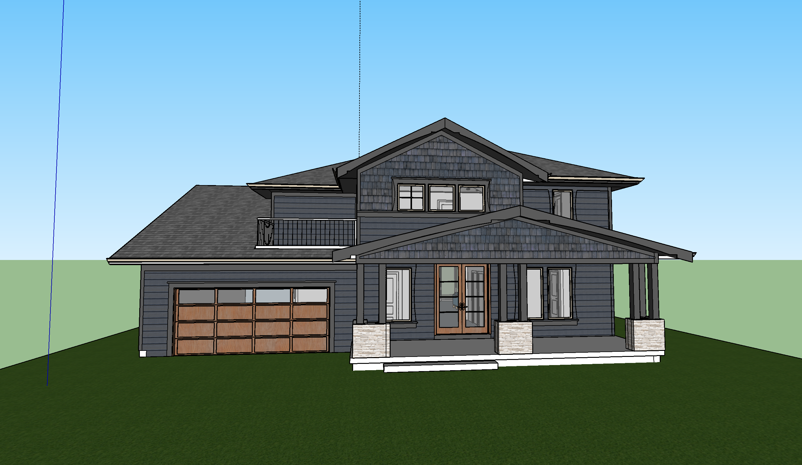 render this to look photorealistic with a nature background farmhouse add floral light landscaping make the walls and trim match color to the original and the front door make them a medium stain wood siding a lap siding with a board batten look under the windows add small sized beam extension corbels at the roof peaks and make them the same color as the garage door windows to be black add light landscaping a driveway off the garage and stoop and walkway to the front door and let me see a little of the street as well midday day lighting white stone where brick is shown do not change the shape of the home
