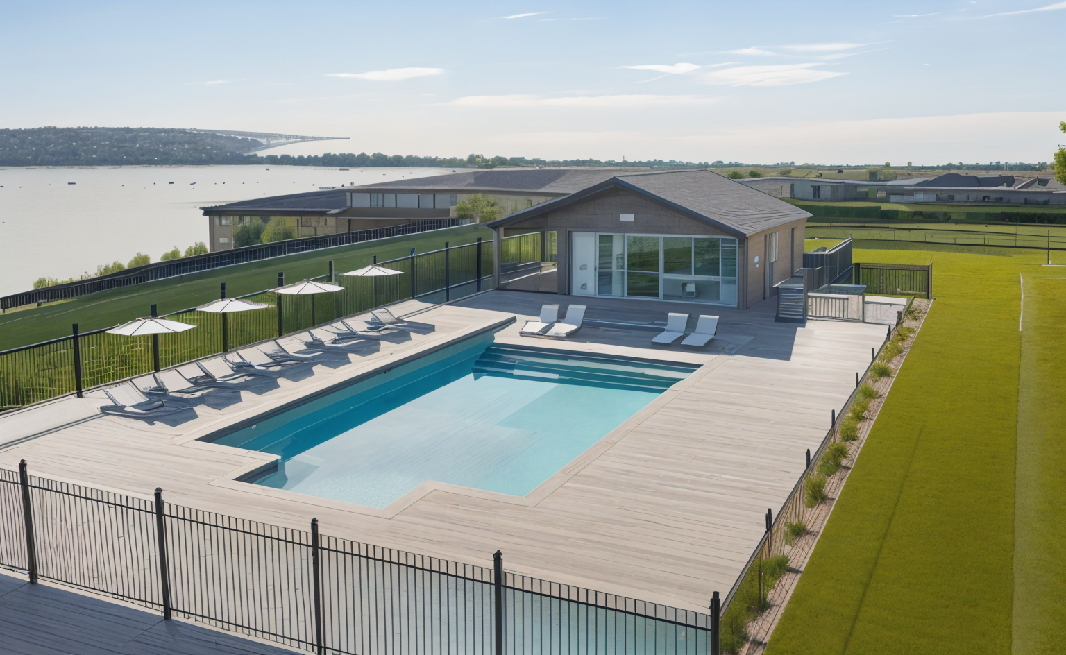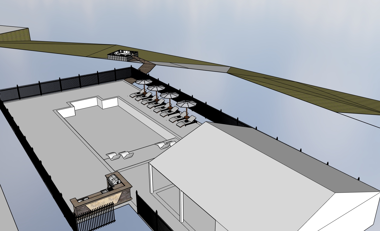 new urbanism exterior shot create a 3d rendered visualization of a community pool area incorporating the following specifications pool design maintain the pool s shape size and layout exactly as shown in the provided sketch include the broad entry steps along the shallow end and the surrounding paved deck area pool house position the pool house at the head of the pool matching the proportions and roof style in the sketch the pool house should have three open bays and a pitched roof outdoor kitchen include the outdoor kitchen area adjacent to the pool house on the right side feature built in cabinetry a grill undercounter refrigerator and prep counter as shown lounge and umbrellas arrange multiple lounge chairs along the left side of the pool each paired with a large umbrella exactly as in the sketch place four additional lounge chairs on the far side of the pool near the pool house steps fence and landscaping surround the entire pool area with a black metal picket fence matching the style in the sketch outside the fence perimeter add lush well maintained landscaping with ornamental grasses flowering shrubs and small trees to create a welcoming environment parking area depict a parking lot adjacent to the pool enclosure with several parked cars to illustrate community use the lot should be paved with clear striping and accessible spaces natural slope and river extend the site beyond the fenced pool area with a gentle slope leading down toward the river s edge cover the slope in dense trees and natural vegetation to blend with the environment indicate the river in the background as a blue water surface bordered by trees atmosphere and lighting render the scene in daylight with partly cloudy skies to provide soft shadows use warm inviting lighting to highlight the pool deck and outdoor kitchen areas note keep all dimensions proportions and placement of major elements pool pool house kitchen fence and furniture consistent with the provided sketch emphasize a clean organized layout that conveys a modern community recreation space architecture