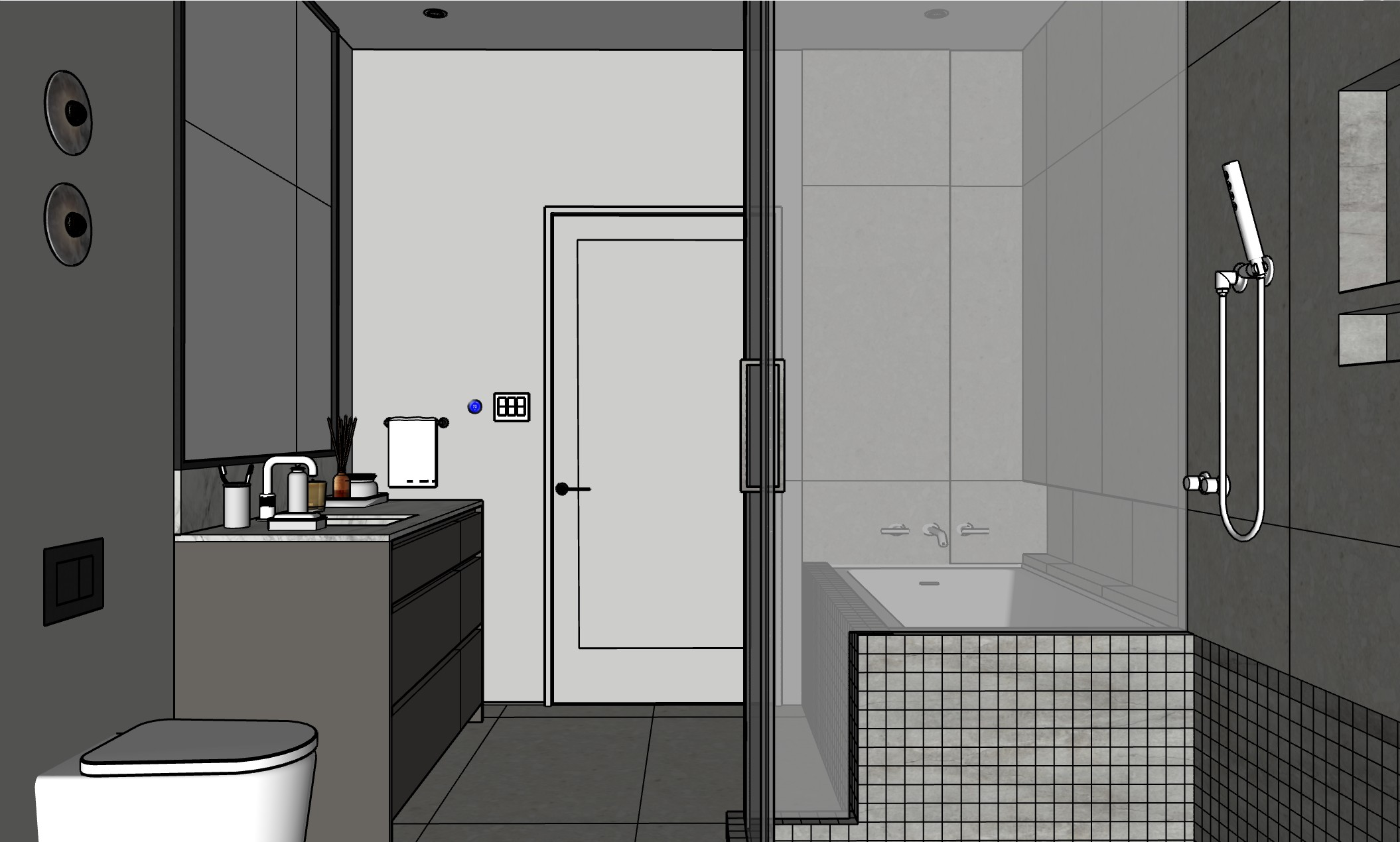 a sleek modern bathroom with a sophisticated atmosphere the walls are smooth soft greige matched with a darker gray tiled floor the vanity is a deep charcoal with a white marble countertop holding elegant black and silver bathroom accessories add a minimalistic chrome faucet and a stylish rectangular mirror with led behind the bathtub is encased in small glossy light gray tiles include a frameless glass shower enclosure with a sleek silver handle soft ambient lighting casts gentle shadows enhancing the contemporary feel the colors should exude tranquility and elegance creating a refined space