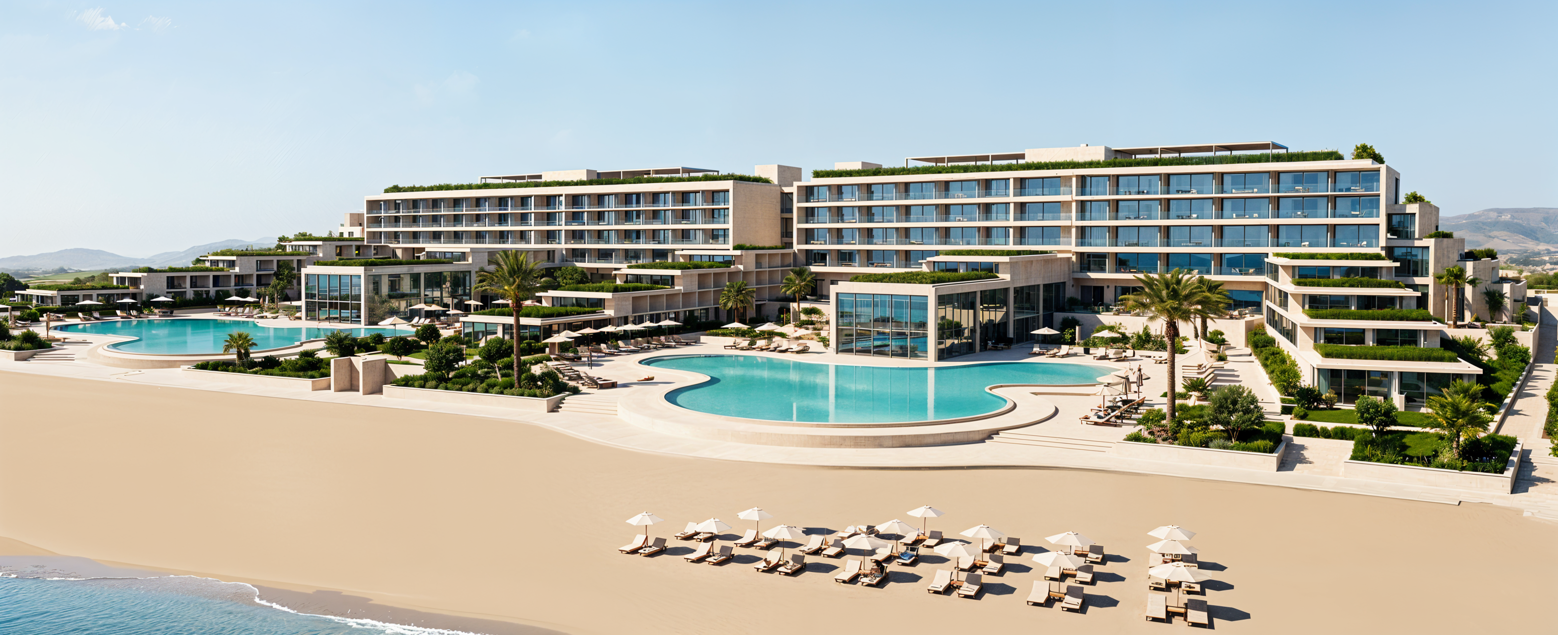 perform a visible and noticeable lighting and color correction on the existing image this is a post processing task only no geometry no objects no scene elements may be changed lighting mandatory change reduce harsh direct sunlight convert lighting to softer diffused mediterranean daylight lower contrast between highlights and midtones reduce specular highlights and artificial shine light must feel natural airy and evenly distributed the result must look visibly softer than the original color correction mandatory change reduce overall color saturation by approximately 10 20 specifically soften green tones and water tones remove plastic artificial or oversaturated colors maintain realism do not desaturate too much colors should feel delicate calm and natural tone response reduce hdr like effect reduce sharpness and digital crispness slightly introduce a more photographic filmic light response natural transitions between light and shadow important changes must be clearly visible compared to the original if the image looks the same the task is not complete do not do not change architecture do not change materials do not add or remove people plants or objects do not change composition or background goal a softer more realistic high end architectural render with delicate colors and diffused light as if professionally color graded from a raw render