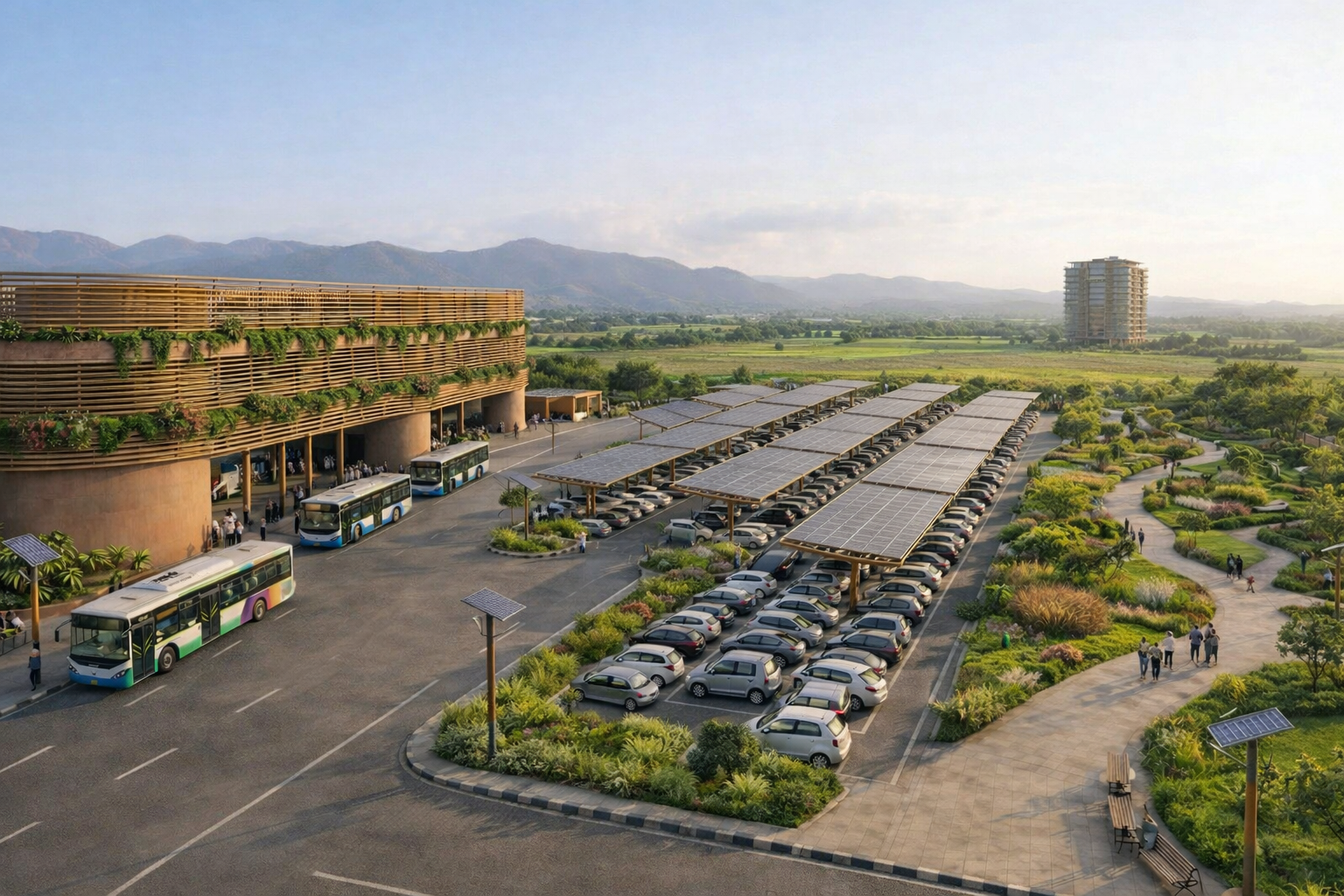 photorealistic architectural render based strictly on the provided image relocate the 10 story building into the farmland in the background but keep it closer and clearly visible not at the extreme horizon the building should appear farther away than the bus terminal but closer than the mountains embedded within the agricultural landscape create a horizontal road across the front of the image running left to right in front of the terminal and parking area this road should function as a main access street separating the foreground from the terminal and parking reduce the size of the parking area and the park in the front making room for this new horizontal road keep the parking and park behind the new road closer to the terminal preserve the farmland in the background extending behind the relocated building to maintain the rural setting and depth maintain original lighting camera angle scale and architectural style do not add new buildings skylines or urban density