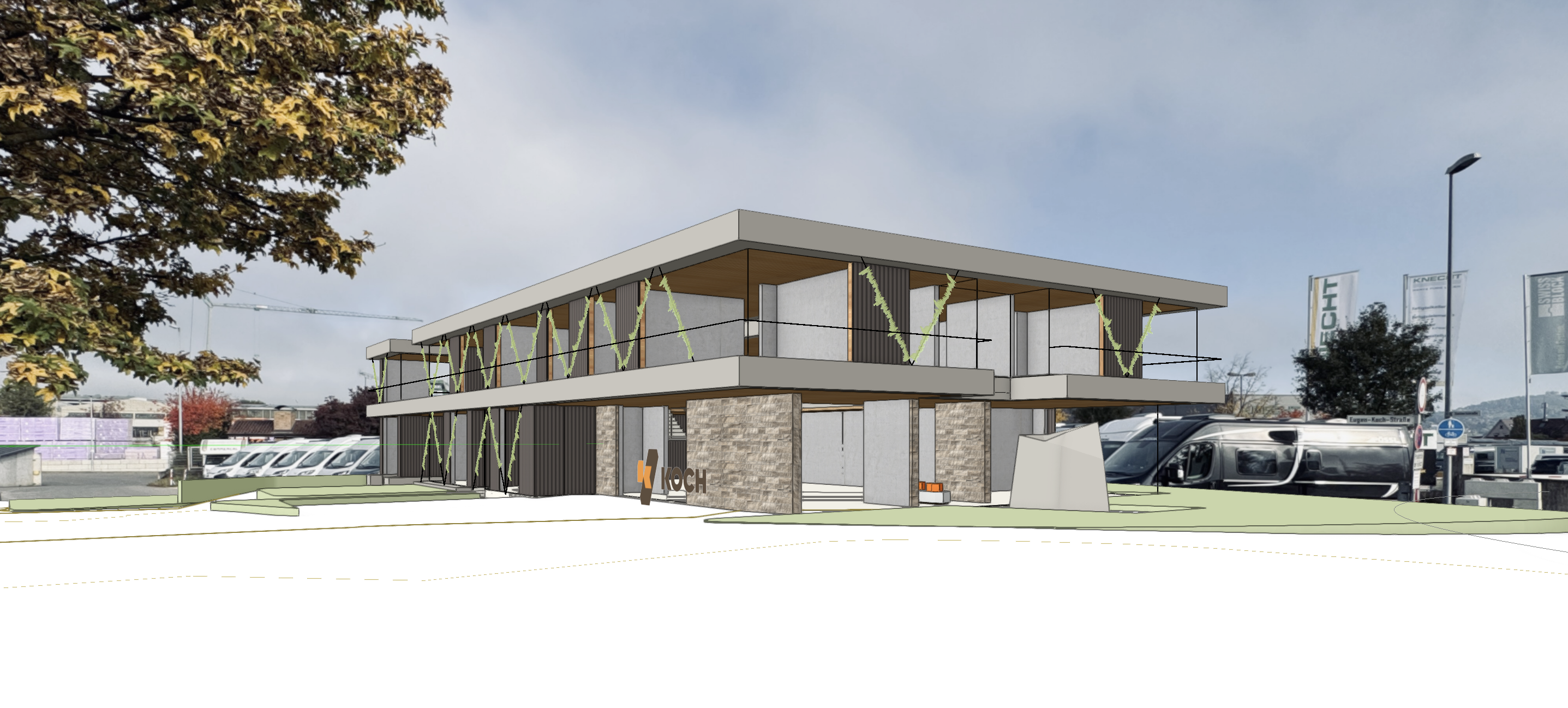 render a modern architectural office building with two stories featuring a sleek design use trapezoidal sheet metal gray for the fa ade with accents of stone texture in warm beige the windows are large with a reflective glass finish framed by dark steel the roof is flat and the overall structure is minimalist surround the building with a lush green lawn and subtle landscaping include a clear blue sky with soft clouds to create a serene and inviting atmosphere