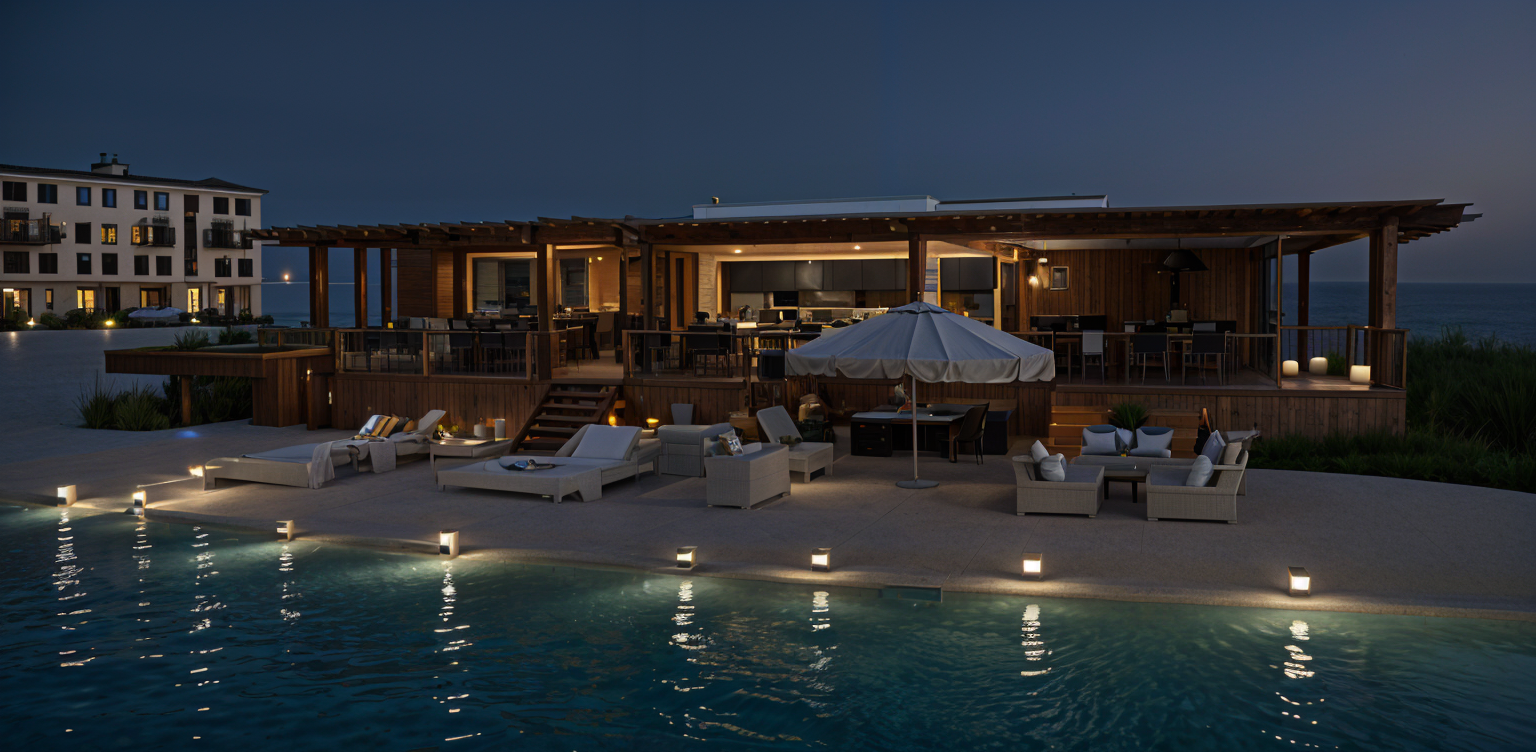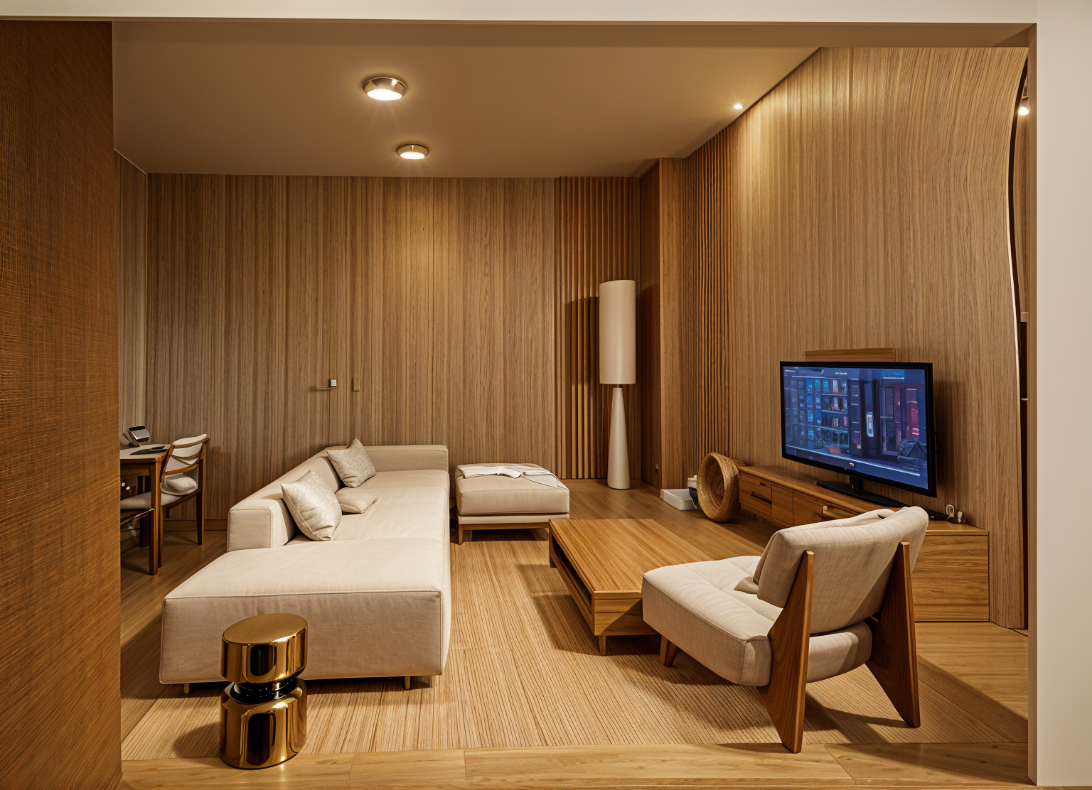 modern two story house with a sleek minimalist design the structure features a clean white facade with a contrasting section of light wood paneling on the upper right the roof is pitched with a soft grey color complementing large dark framed windows the lower level displays white brickwork enhancing the modern aesthetic the garage door is a seamless white with horizontal lines use soft turquoise for the window reflections to suggest a bright sunny day surrounding the house add sparse greenery for a touch of nature the atmosphere should be calm and contemporary with a serene suburban setting architecture