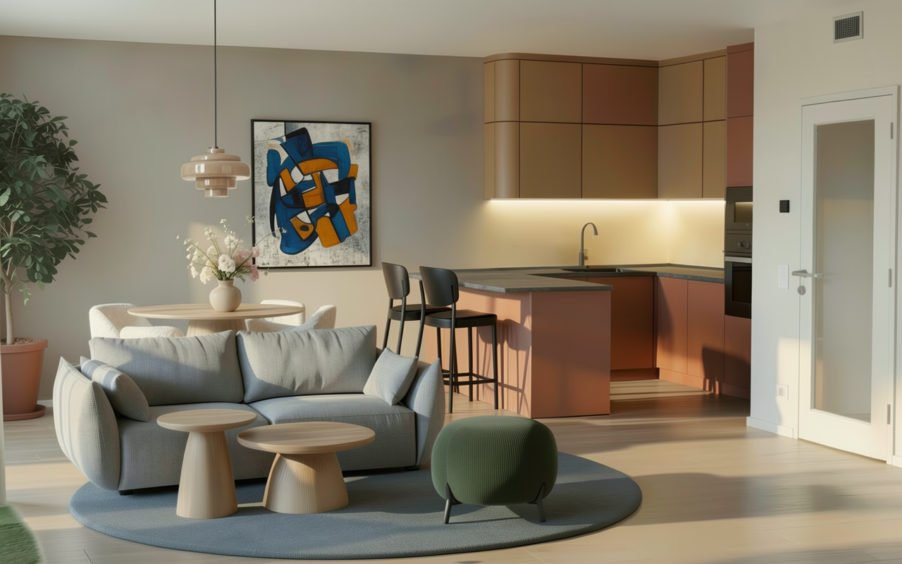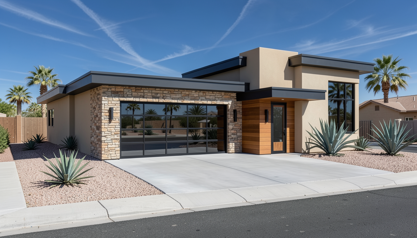 use the provided architectural model exactly as reference do not modify the architecture proportions or geometry material placement must match the design exactly material assignments garage wall natural stacked stone main house walls smooth beige stucco entry tower volume horizontal wood siding from bottom to top with no stucco interruption wall beside the front door horizontal wood siding roof fascia and trim dark charcoal metal garage door black framed glass panels the vertical entry tower must be fully clad in horizontal wood siding from the base of the wall all the way to the roof line no stucco should appear on this tower volume wood siding description modern horizontal cedar siding warm natural brown tone visible grain consistent board spacing subtle variation between planks explicit restriction no stucco on the tower no stone on the tower tower material is entirely wood siding stone description natural stacked desert stone only on the garage wall lighting bright palm springs midday sun with neutral daylight color balance environment palm springs residential neighborhood with desert landscaping agave plants gravel ground cover concrete driveway curb and asphalt street sky deep blue desert sky with thin wispy cirrus clouds camera professional architectural real estate photograph full frame dslr 35mm lens f 8 iso 100 rendering style ultra photorealistic architectural photography with realistic materials and subtle imperfections