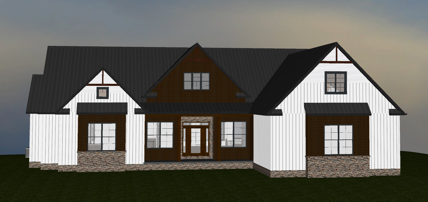 country setting oak trees behind concrete drive landscaping in front of porch
