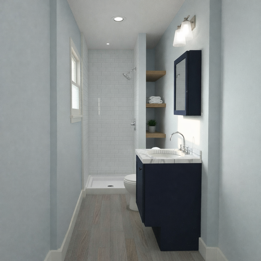 edit this bathroom photo by increasing the definition and making it look more realistic and brighter as if all the lights are on in addition to natural sunlight flooding the room