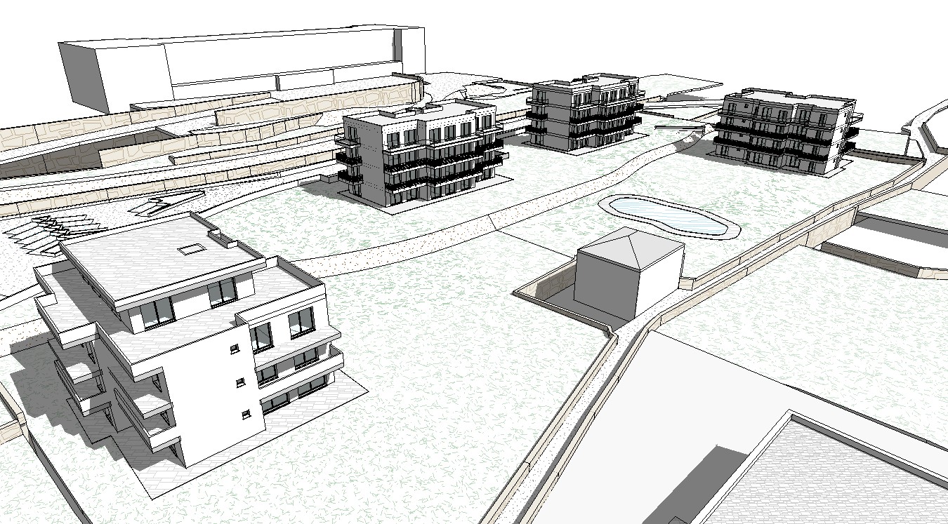 modern exterior shot render a modern architectural complex with three elegant white buildings featuring large glass windows and sleek black railings the atmosphere is serene and sunny casting soft shadows on the light gray stone pavement lush green lawns surround the structures while a tranquil blue pond adds to the refreshing landscape in the background include a warm beige retaining wall with subtle texture the sky is a clear and bright azure blue enhancing the overall peaceful and contemporary feel architecture