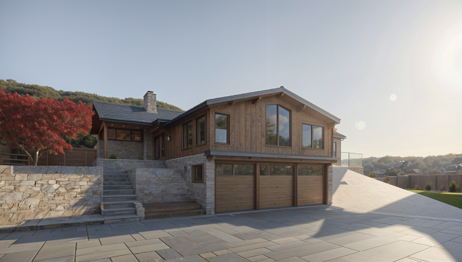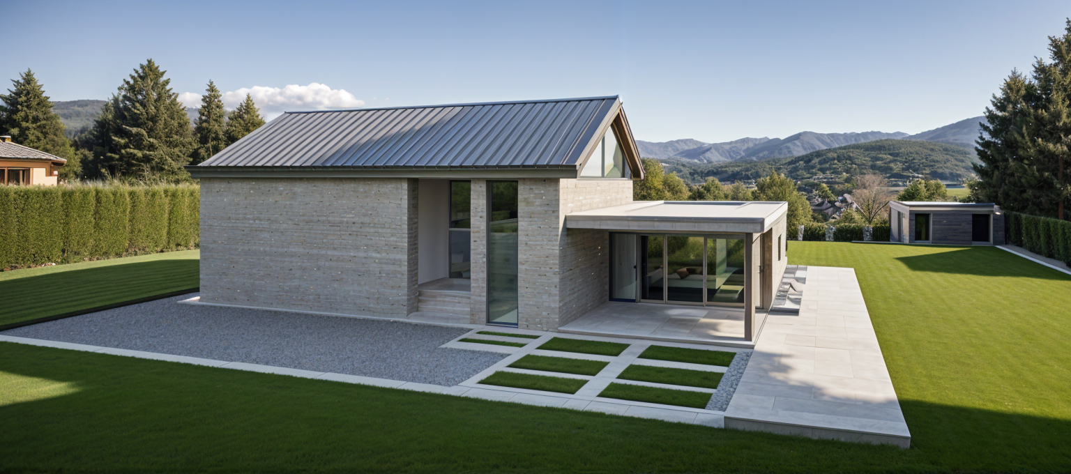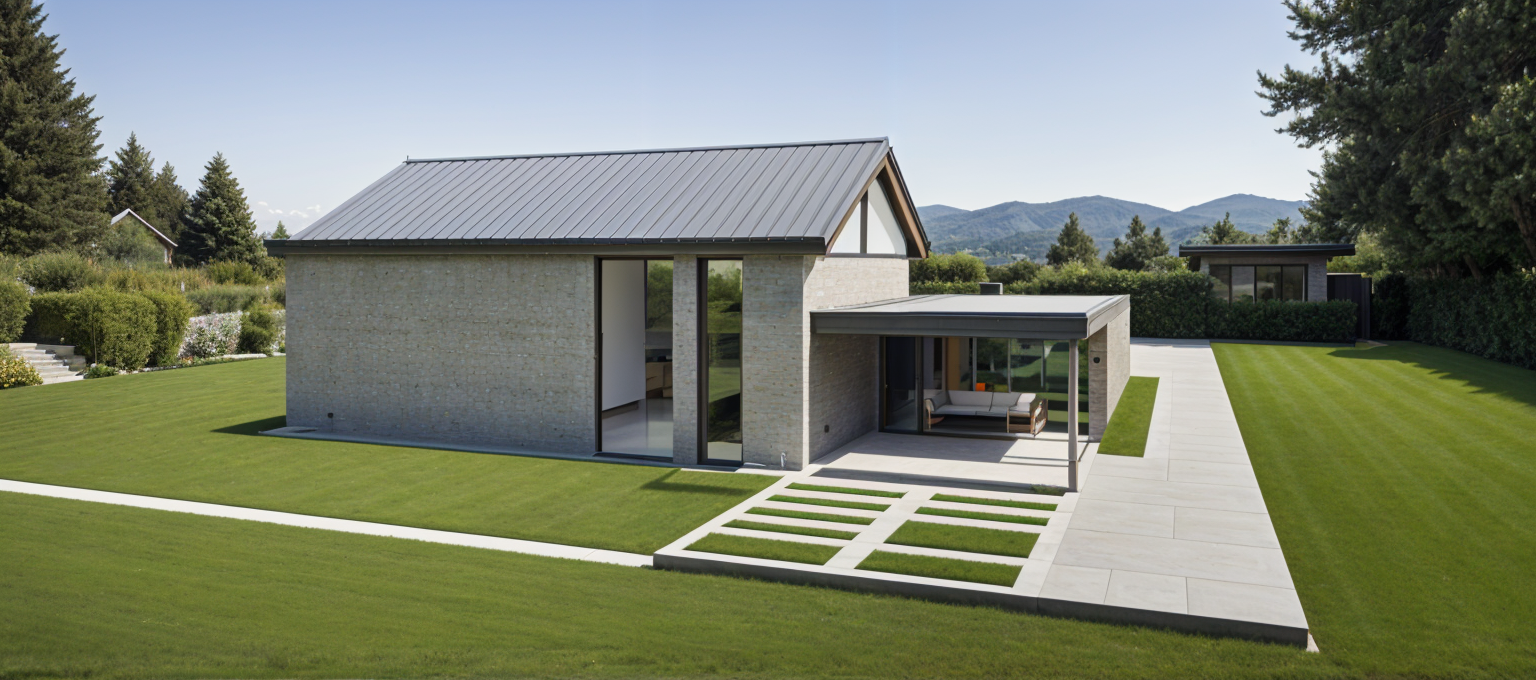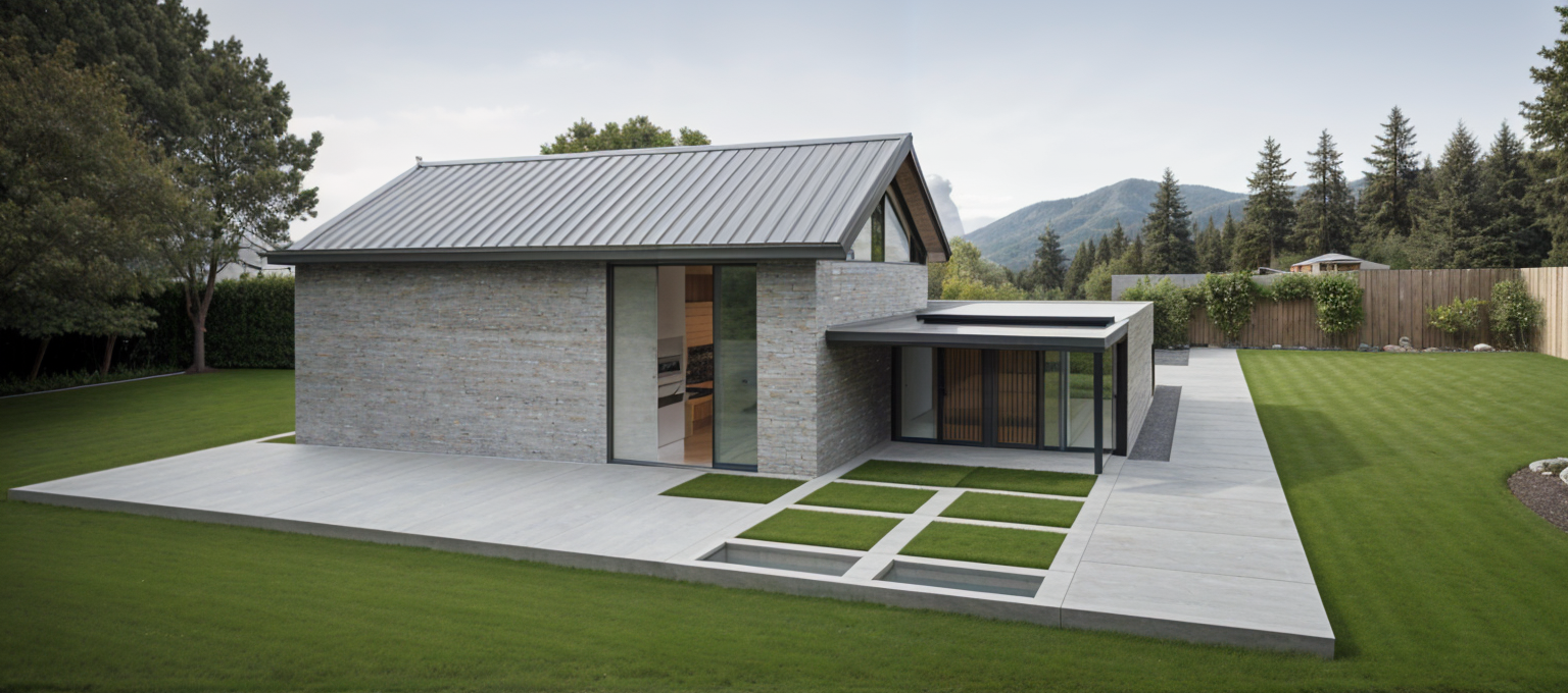 modernist exterior shot a nice lawn around the house a natural grey stone wall with a nice paved concrete slabs an open carport mountain in the background with trees architecture