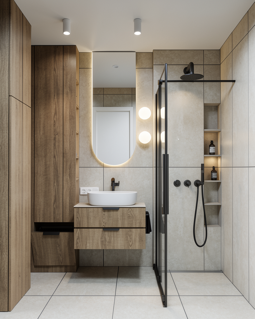 light the interior like a cloudy day transform a bathroom design photo into a hyper realistic architectural visualization of a contemporary modern bathroom preserve the exact geometry layout proportions and materials of the original design lighting create an atmosphere of soft cloudy daylight reminiscent of a cloudy rainy day without visible rain with diffused natural light maintain balanced contrast avoiding harsh shadows and highlights materials and textures enhance the realism of materials micro details surface imperfections soft reflections precise roughness and a physically correct response to light highlight textures light walnut wood grain light beige tiles metal and matte finishes high micro contrast and tangible depth the color of the fixtures and shower enclosure is gray the mirror reveals a tiled wall and a smooth white door two round wall lamps with lights on to the right of the mirror led lighting behind the mirror rendering style ultra photorealistic architectural visualization cinematic quality natural color grading neutral tones soft highlights realistic global illumination physically based rendering high dynamic range premium interior photography camera and composition wide angle architectural lens natural perspective eye level view deep focus sharp details throughout the frame natural framing no distortion ambience calm elegant contemporary upscale residential atmosphere clean minimalist sophisticated and free from visual noise output 8k resolution ultra detailed noise free sharp edges professional quality architectural rendering white sockets no additional led lighting negative cues no raindrops lens flare fog haze blur cartoonishness styling over sharpening artificial glare unrealistic reflections distortion clutter led lighting windows concrete led lighting in cabinets led lighting in shower shelves