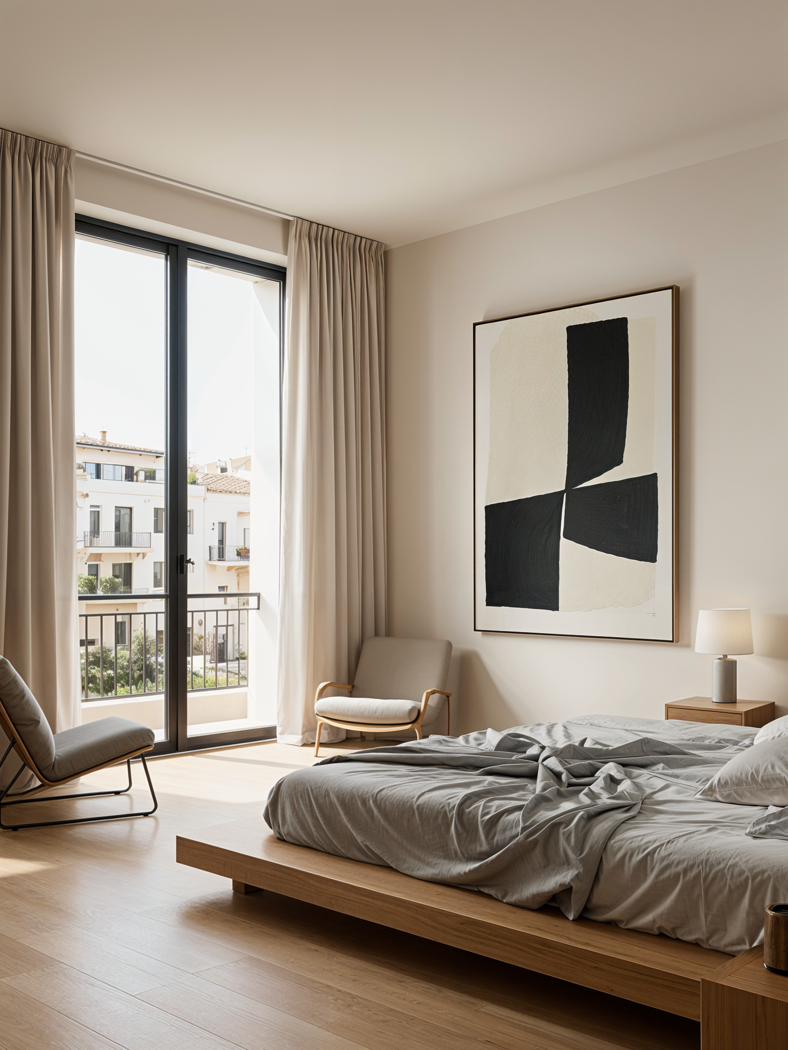 keep the armchair on the left exactly as it is remove the bedside table the lamp and the right armchair add a wide thick white minimalist curtain rod across the top of the window the curtain rod should have a clean modern design ensure the left armchair remains untouched in the final image