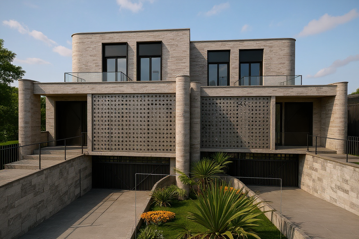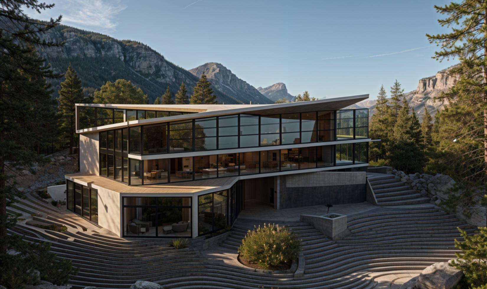 architectural watercolor rendering of a small contemporary mountain research station realistic and detailed architecture built from warm wood black steel and glass accurate perspective realistic materials visible joinery and structure surrounded by abstract watercolor landscape of mountains and pine trees softly fading into white paper background painted with loose brushstrokes pastel greens and blues architectural drawing overlays with fine technical lines light annotations and grid hints composition centered on the building as precise and grounded while environment is fluid and artistic soft daylight serene atmosphere concept art aesthetic