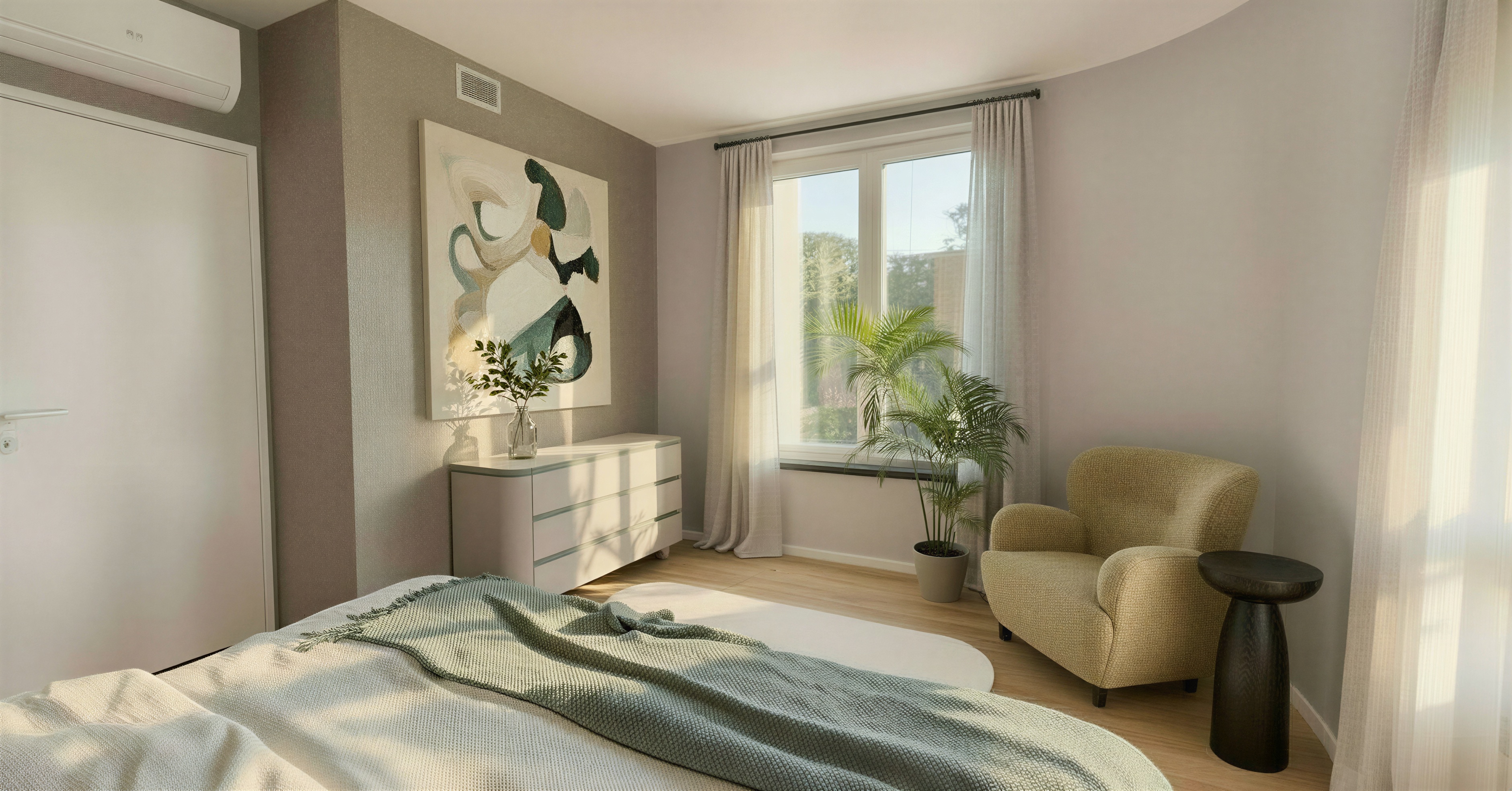 change texture of the arm chair to boucle texture change plant pot to concrete pot
