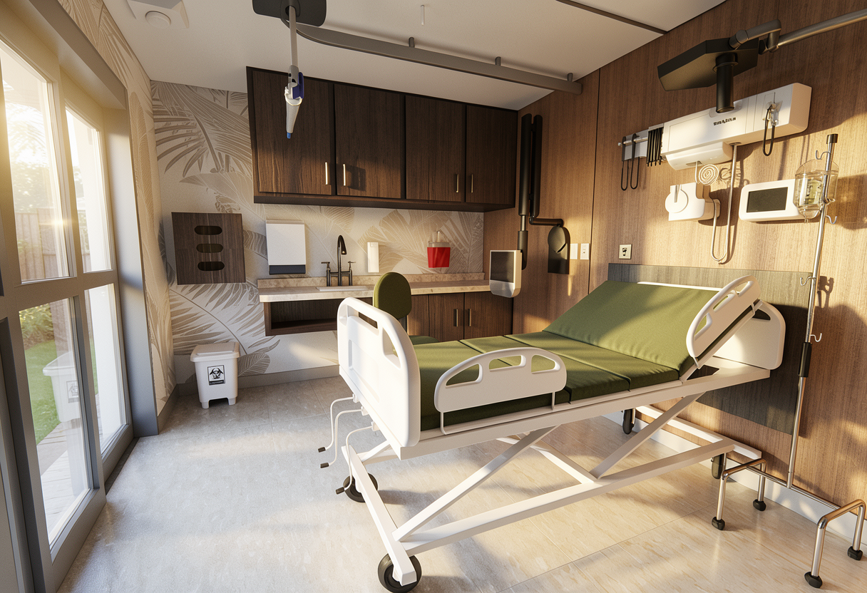 render a hyper realistic modern high end contemporary three story house in florida setting where there are palm trees and the lights are lit up on the outside of the house the window frames are dark gray the front right wall is in a little bit darker gray paint on the upper side maintain the window design where there are shutter design on left and right side the garage door is a sleek modern design in matte gray with wide horizontal panels and narrow glass inserts that create a clean contemporary look while letting in controlled natural light the roof is gray metal roof featuring a mix of gray brick white stone featuring large windows the exterior features a horizontal walnut wood panels on the left center where the 3 windows are located and it wraps around on the left atleast 1 foot the finishing around the garage doors are light gray bricks the entrance includes a square arched in dark gray bricks the main door is 6 feet wide made of frosted glass with 4 horizontal mulls the trellis are all in walnut brown the walls are a soft light gray with a smooth finish creating a serene and inviting atmosphere with lots of greeneries and landscape and with dramatic sky