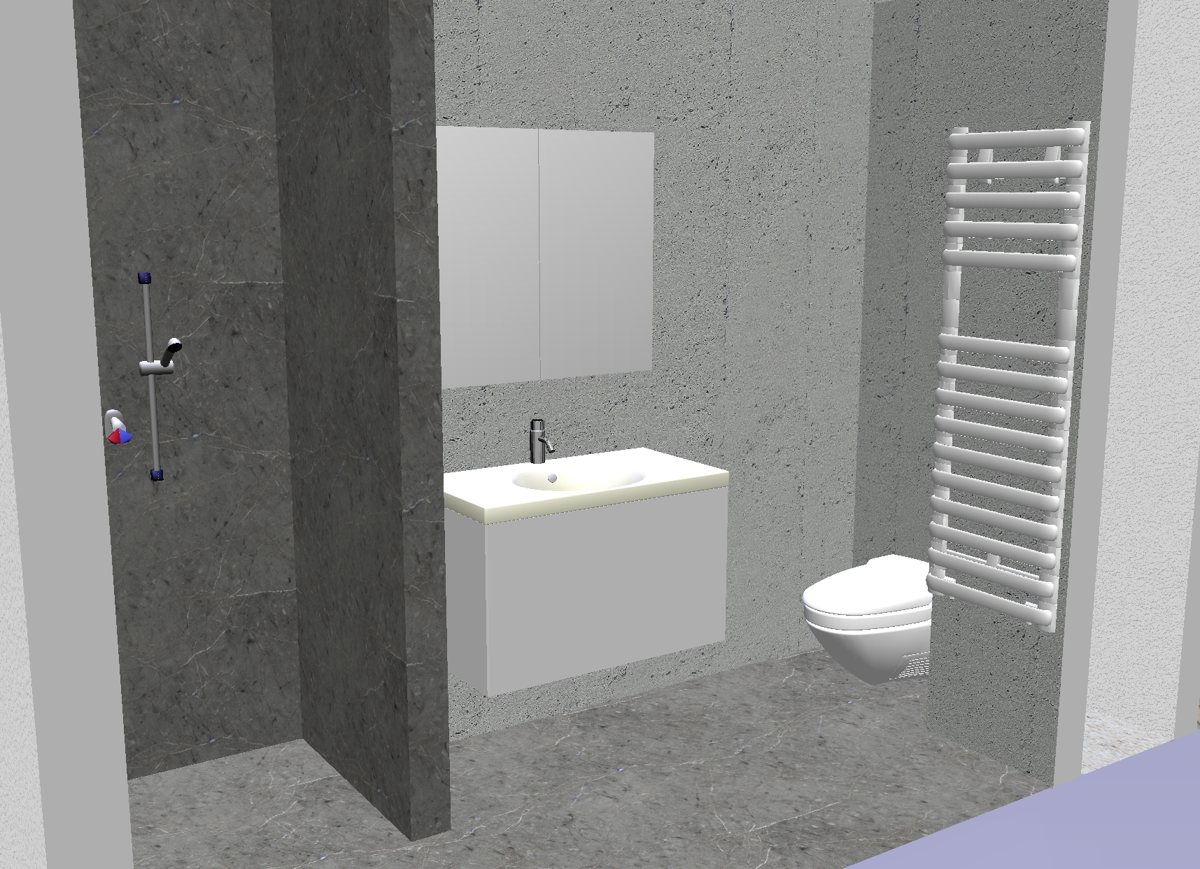 genau dieses rendering berarbeiten fotorealistisches innenraum foto exakt gleiche perspektive und kameraposition wie das hochgeladene referenzbild 100 identische raumgeometrie exakt gleiche m belanordnung weiches nat rliches tageslicht ganzer raum zus tzlich k nstlich ausleuchten sanfte realistische schatten blickrichtung ist nach osten sonnenlicht kommt von s den realistische materialien echte holztexturen stoff mit leichten gebrauchsspuren hochwertige oberfl chenreflexionen lavabo inklusive unterbau aus marmor collemandina grigio in braungrau dunkel lavabo innen ebenfalls collemandina im unterbau im obersten drittel eine griffmulde ber die ganze breite unterbaum bel mit unterbaubeleuchtung hinter dem lavabo eine vola wandarmatur edelstahl vollkommen rahmenloser und bis auf f nf zentimeter versenkter und hinterleuchteter spiegelschrank links neben dem lavabo ist die dusche thermostatmodul axor select mit stabhandbrause und grosser wandtellerbrause vertikales led ber die ganze raumh he ganz links hinten in der dusche rechte seite in der dusche kein led w nde in der dusche und boden collemandina grigio in braungrau alle anderen sichtbaren w nde sind sichtbeton die toilette ist in der nische hinten auf der rechten seite moderne toilette vertigo wandh ngend in farbe weiss matt tecelux bet tigungsplatte toilettenpapierhalter in edelstahl mit papier an der wand links von der toilette an der grossen wand handtuchradiator vola t39 el mit 5 heizst ben in edelstahl an der fl gelwand auf der rechten seite mit weissen badet chern links und rechts vom lavabo handtuchstangen und handt cher in weiss schwarze steckdose rechts vom lavabo schwarze runde deckeneinbauspots in der nische vorne rechts ist ein unsichtbarer schacht ohne irgendwelche installationen sehr moderner minimalistischer look nat rliche farbwiedergabe golden hour feeling das bild muss wie eine professionelle fotografie aussehen es soll ein echtes und reales foto sein canon eos r5 35 mm festbrennweite f 2 8 hyperrealistisch dslr qualit t raw aufnahme 8k aufl sung extrem scharf perfekte tiefensch rfe professionelle architekturfotografie