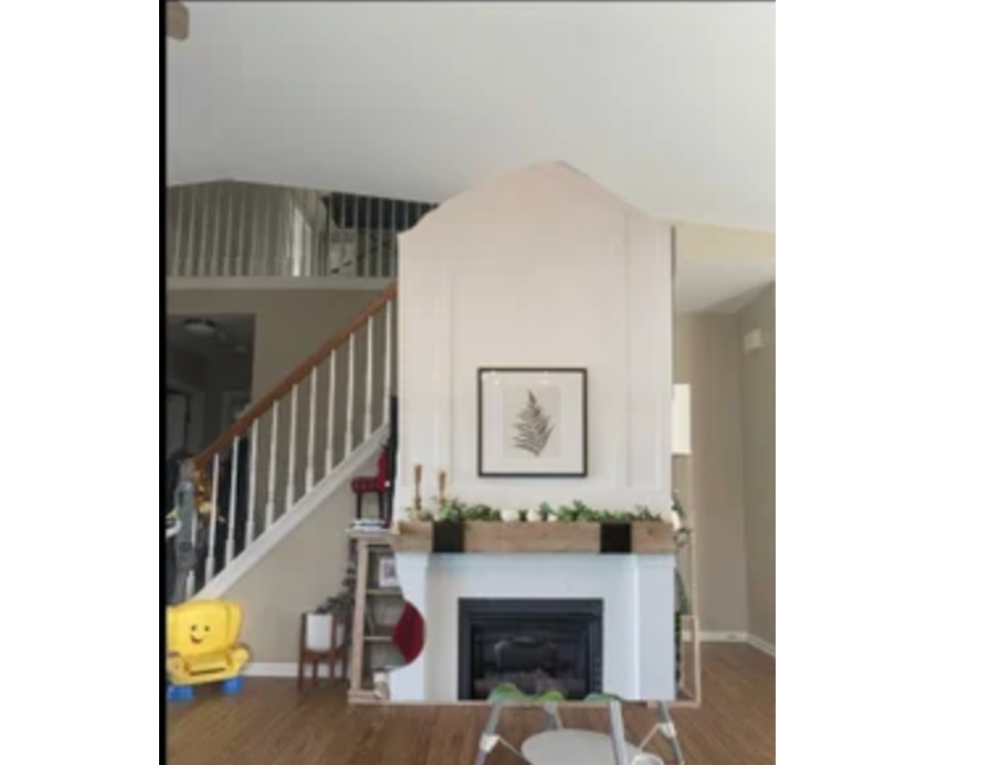 clean up this image and make it look more modern black iron staircase bausters remove the toy clutter wood fooring to fireplace linear electric fireplace tv above add box mantel shelf add panel moulding
