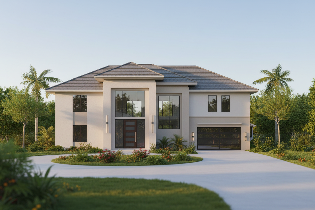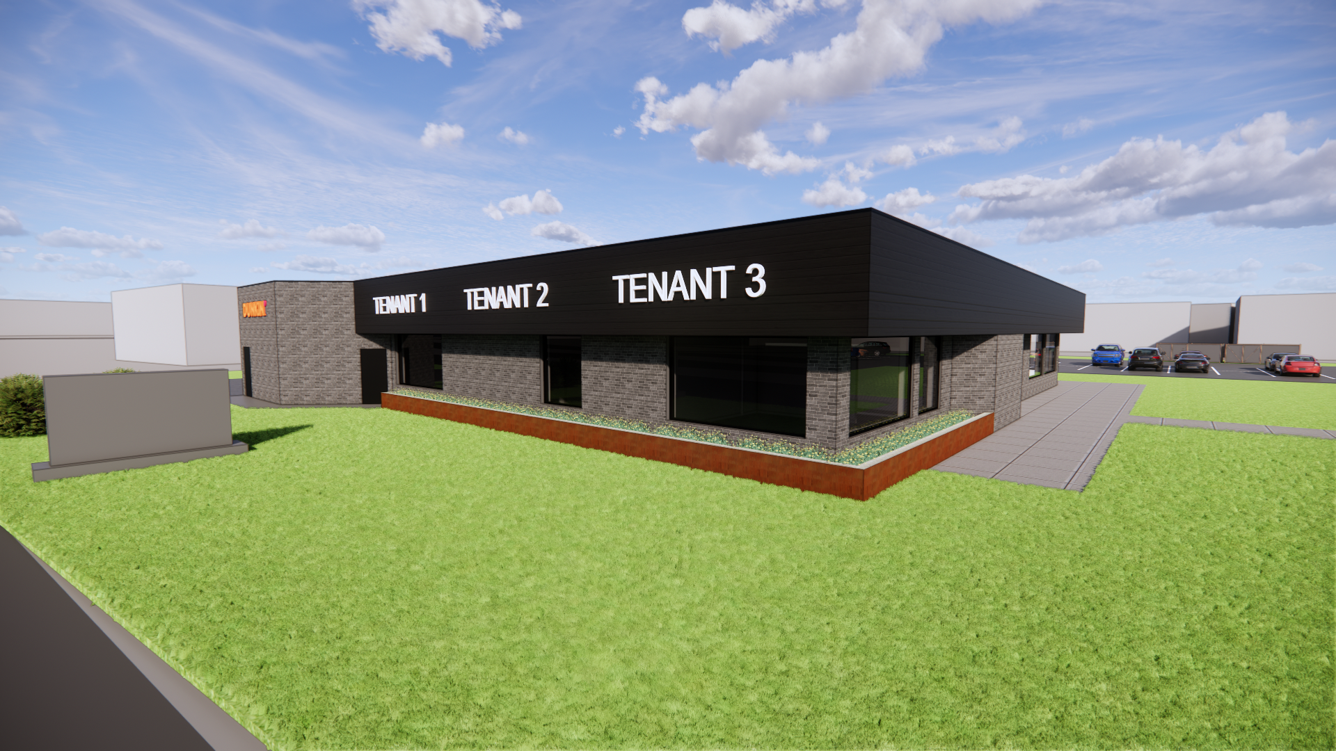 make more photorealistic add minimal vegetation around the sidewalk only adjust daylighting keep materials and form exact make the grass texture a clean cut grass