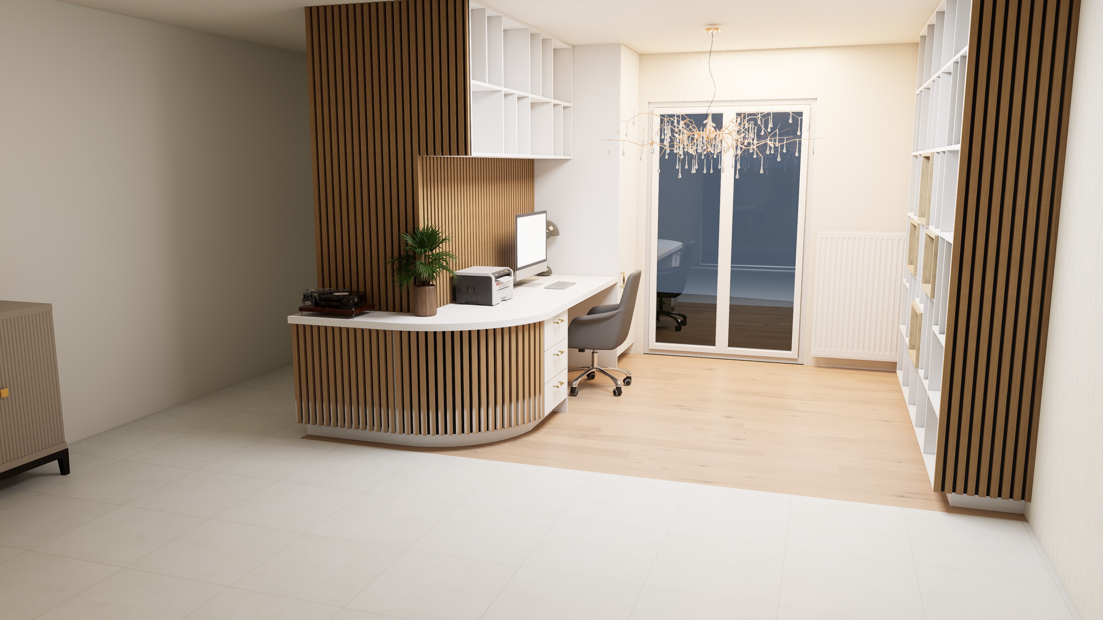 make this scene even more realistic don t change the colors or any other elements of the scene you can add lights and shadows to make it more realistic you can also fill the bookcase and the tall cabinet with books vases or other items