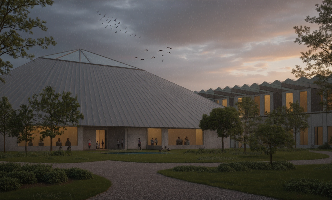 draw this render at during the day in a good weather but not too green