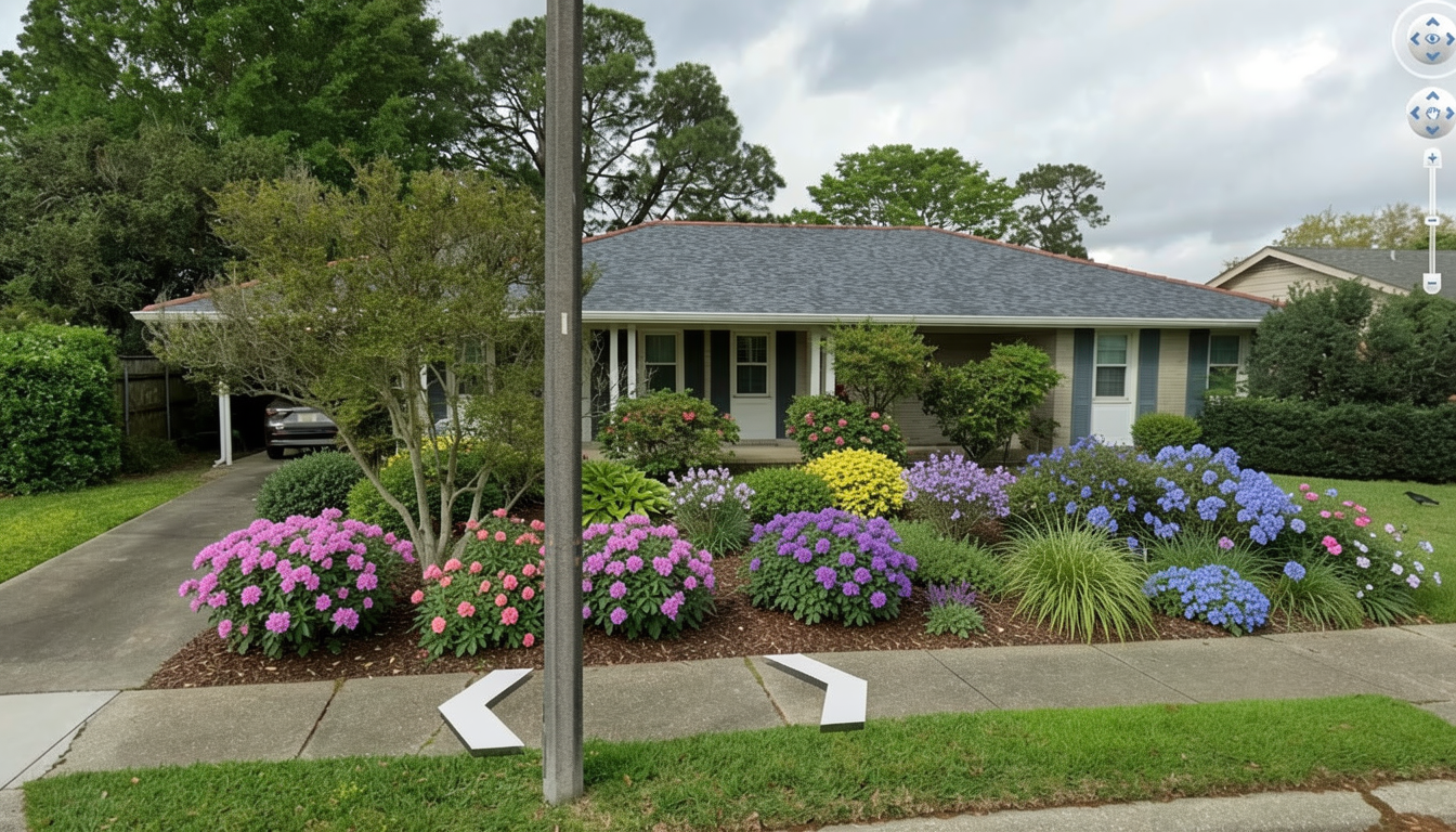 do not plant the front lawn plant two shrub rows along the front of the house at a maximum with of eight feet use color but don t use too many annuals perennials use encore azaleas sunshine ligustrum camellias and popular companion plants