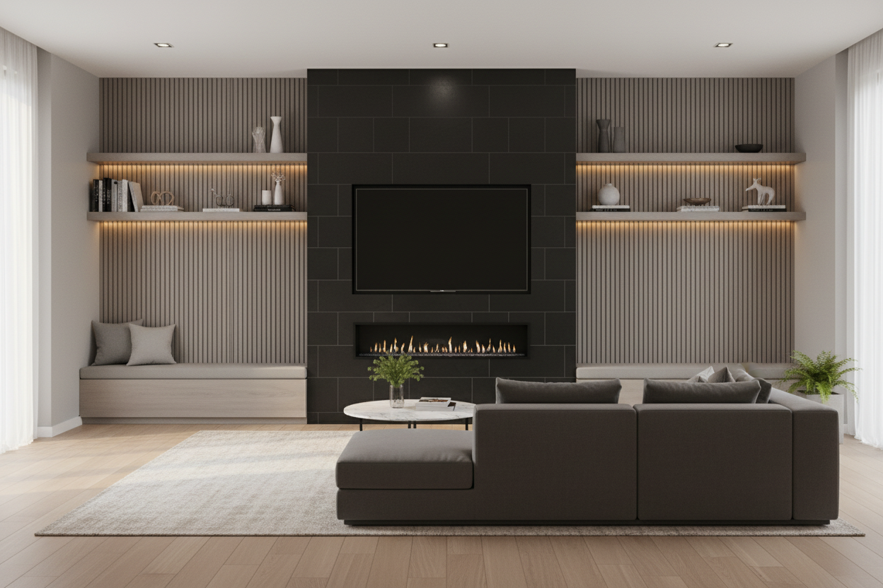 luxury bedroom interior deep green walls terracotta red upholstered platform bed with tall rounded headboard white linen bedding abstract green marble sculptural wall panel above headboard blonde wood floor with subtle floral grain pattern large floor to ceiling windows with new york city skyline view daytime light green marble ceiling with recessed led light cove casting warm ambient glow mid century accent armchair in dark red round wall mirror low three drawer nightstand dappled sunlight across floor
