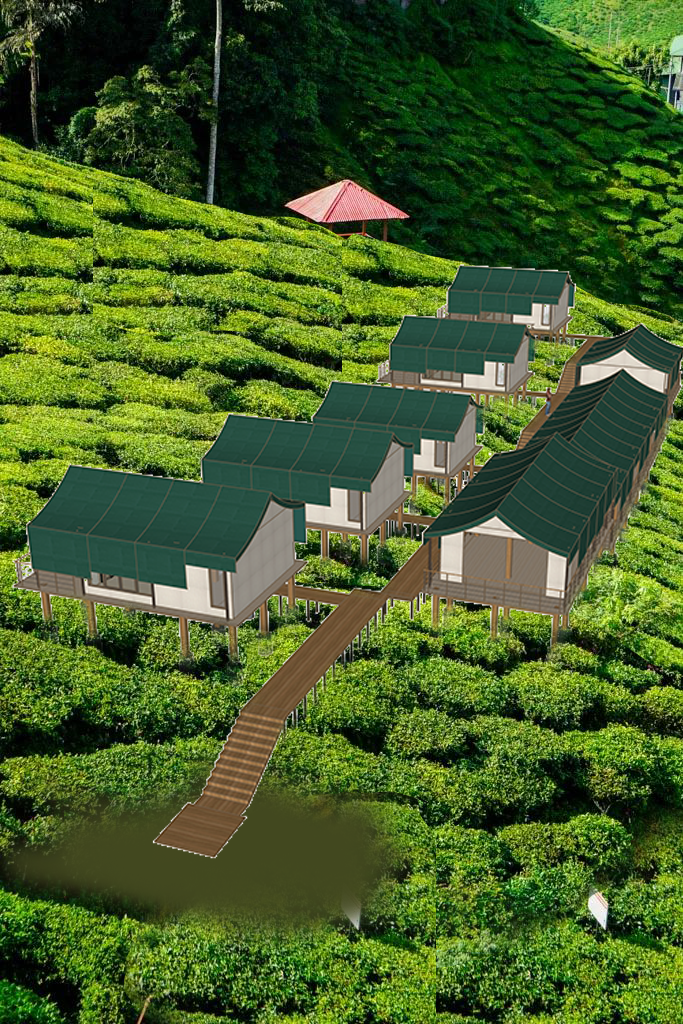 enhance and develop the raw 3d drawing into a realistic render maintain the original building massing angle and all existing elements the site is a vibrant tea plantation with scattered clove trees acting as natural visual barriers between the buildings the architecture features tent roofs and stilt structures making the buildings float above the tea terraces add subtle human activity a few people casually playing and walking around the tea plantation and a couple standing on the balcony of one of the stilt buildings emphasize warm light natural textures and the harmonious integration of the elevated architecture with the layered green landscape