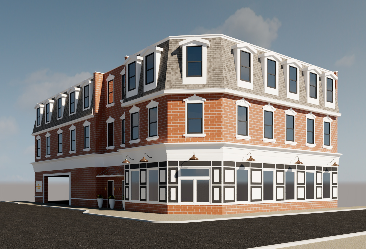 photorealistic small modern two family homes in the background partially covered by trees clear skies day at noon in new jersey the main building is located on the corner of a sidewalk on a side street do not add vinyl siding to the main large building already in the image