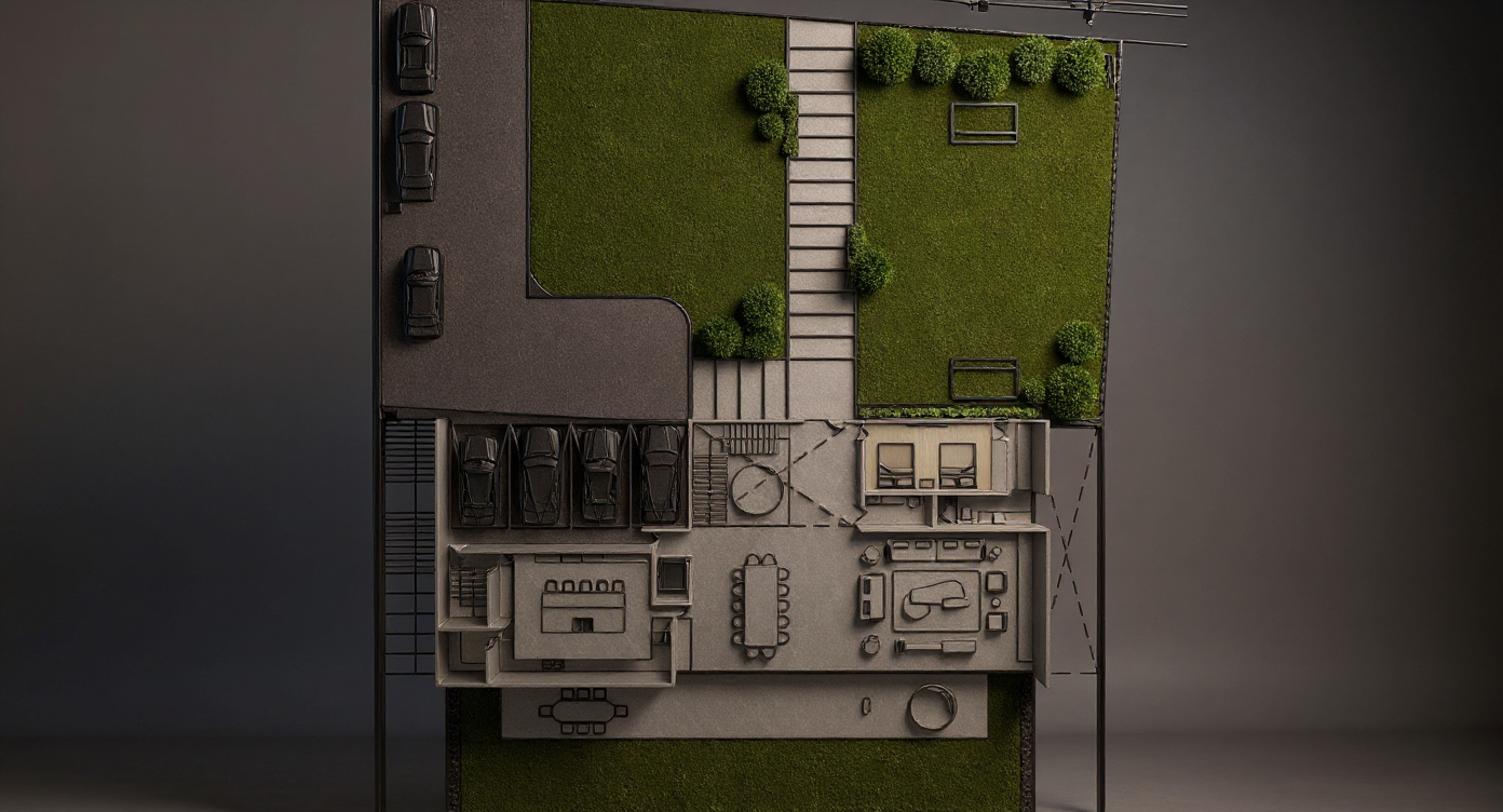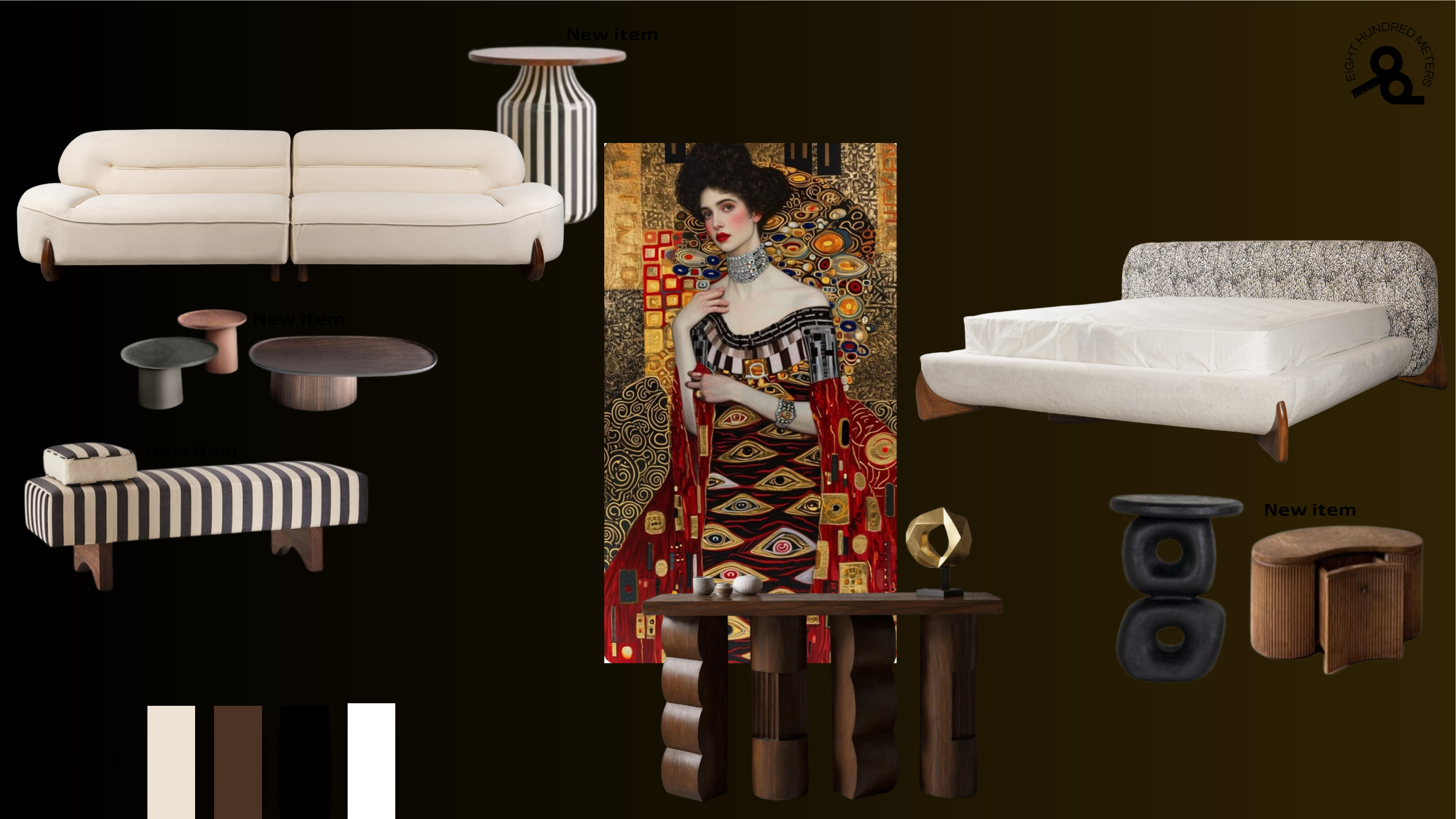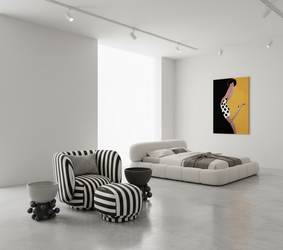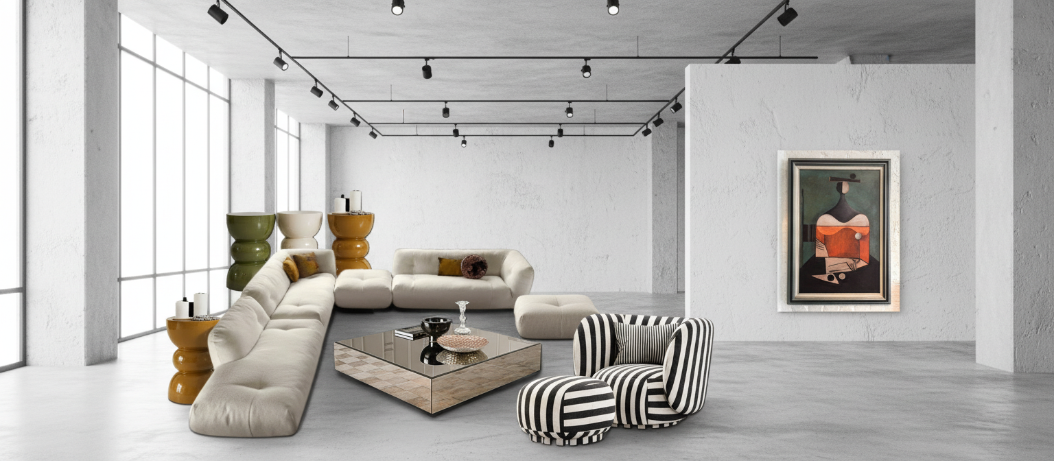 render in showroom concrete floor white walls large scale artwork track light put the side tables beside the sofa