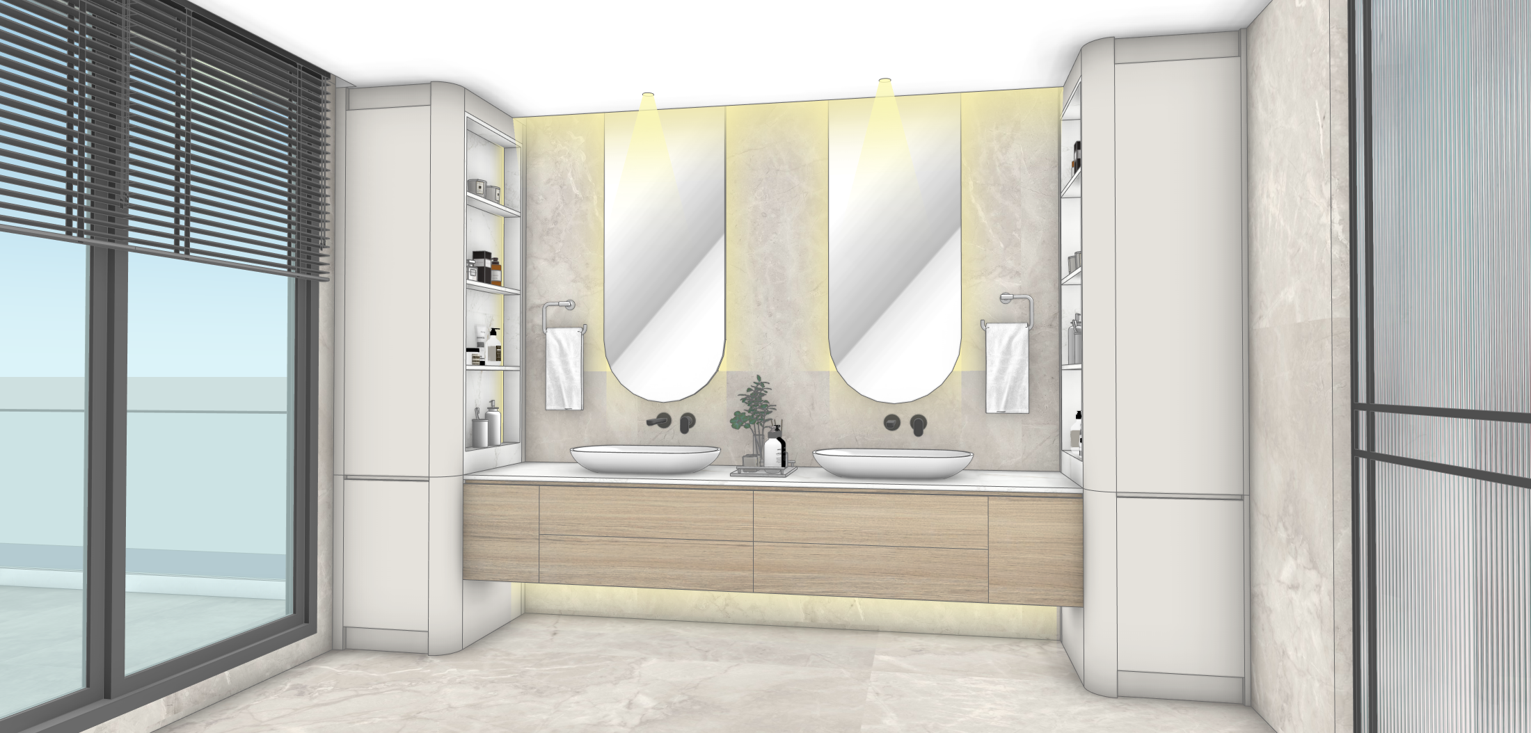 modern double vanity bathroom with floating wood cabinet white solid surface countertop and twin vessel basins tall rounded mirrors with soft backlighting warm wall wash lighting and integrated under cabinet led glow full height beige marble walls light stone flooring built in side shelving and large window with horizontal blinds for natural light clean contemporary aesthetic neutral palette realistic materials soft ambient lighting 8k photorealistic render