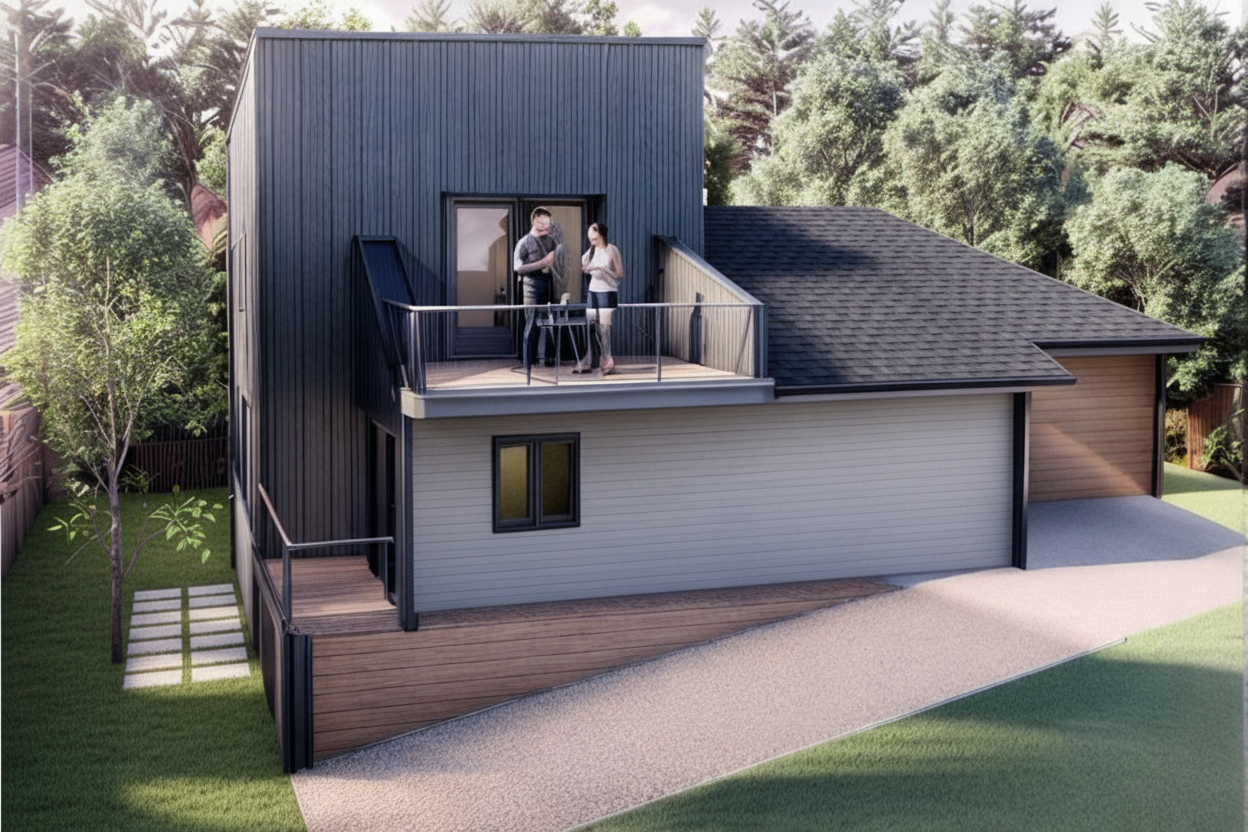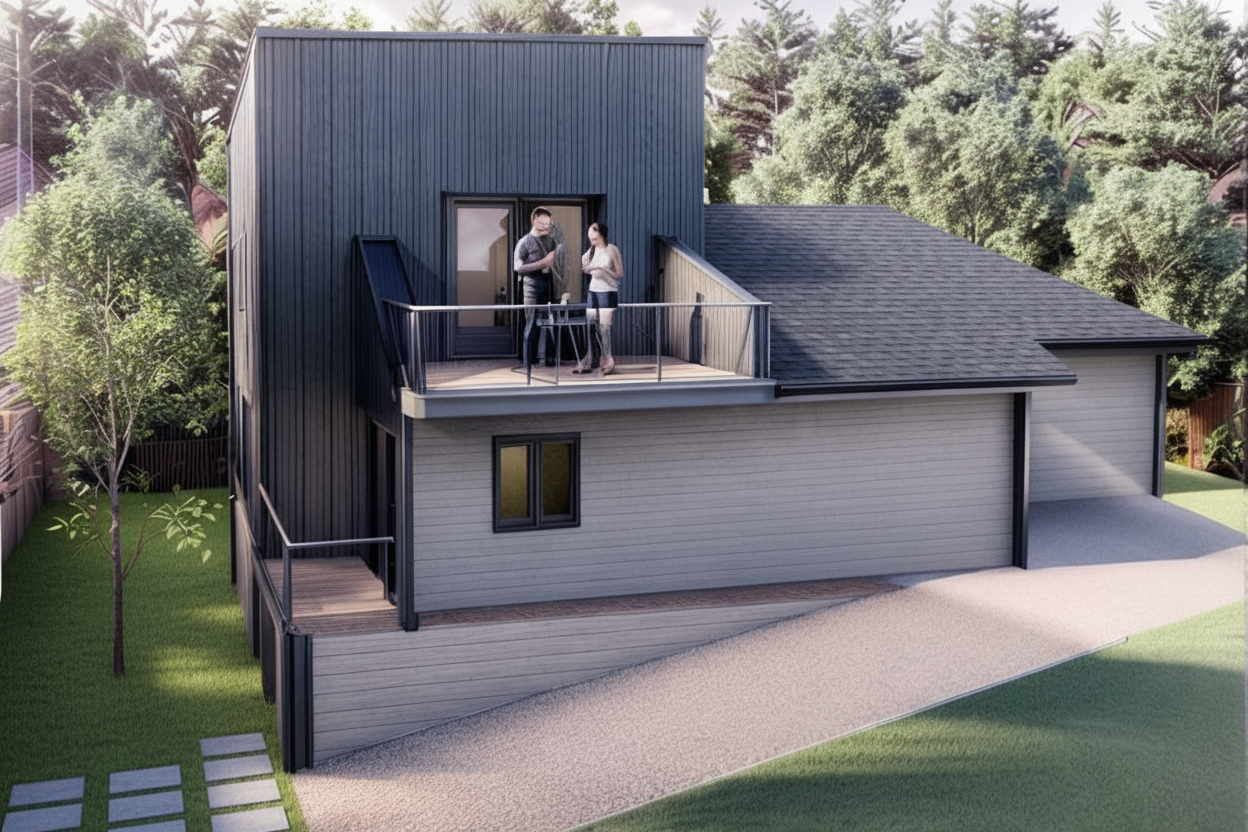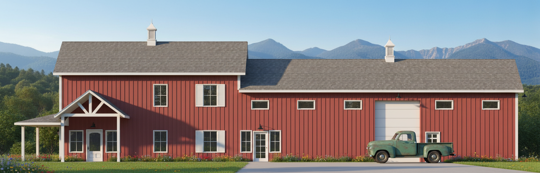 render a picturesque barn structure with a classic architectural design featuring two cupolas on the roof the barn has vertical wooden paneling with a pristine white finish the roof is a muted gray providing a soft contrast the entrance porch showcases rustic wooden beams painted in a deep rich oak hue the doors and window frames are a striking black adding a modern touch set in a serene countryside landscape with lush green fields and a bright blue sky the atmosphere is peaceful and idyllic capturing the essence of rural charm a stone pathway leading to the entrance a concrete driveway leading to the garage door with a green antique pickup truck in the driveway trees behind house