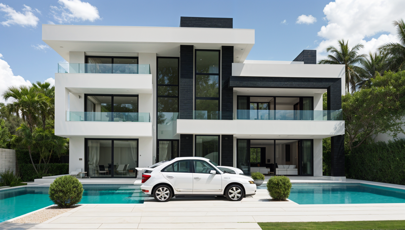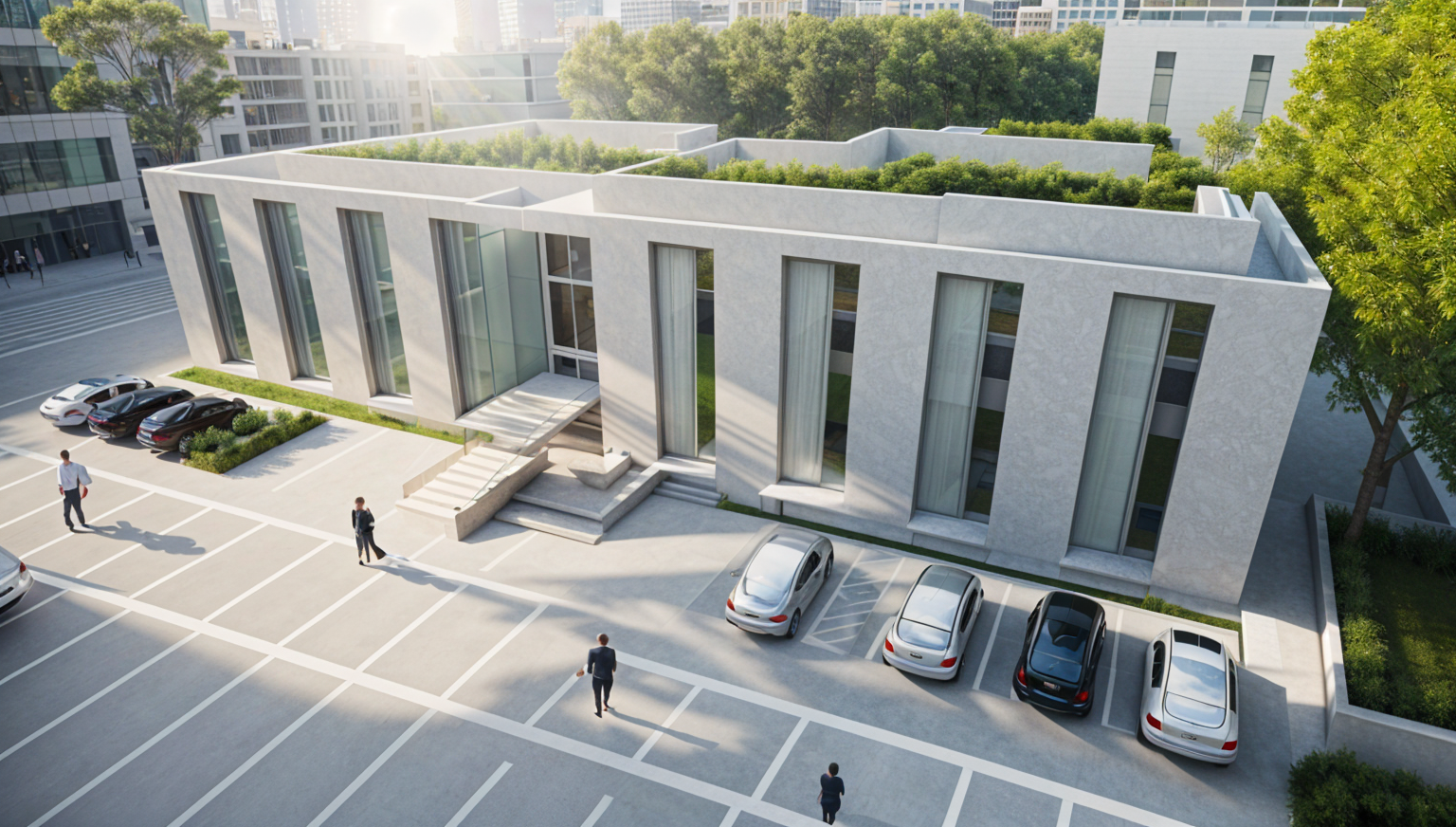 generate a night view with ground spotlights on the edge of pavement illuminating the vegetation two small spotlights marking the staircase entrance