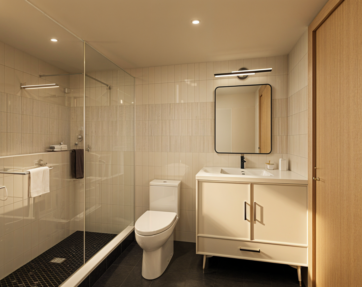 maintain all geometry create a hyper realistic interior rendering at midday this is a first floor room the windows are overlooking a marsh scene the lighting color is 2700k the floor is tile replace the white tiles only with a soft cream marble leave the gray tiles