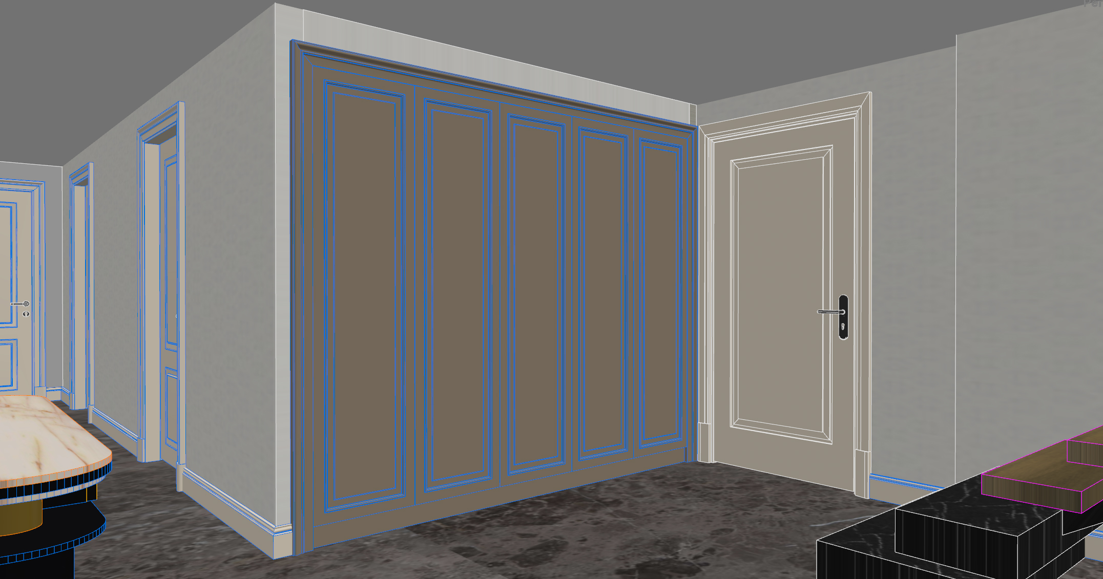 there should be spot lighting on the ceiling the areas with blue stripes should be mink color the floors should be marble there should be a round rug on the floor and the doors should be beige