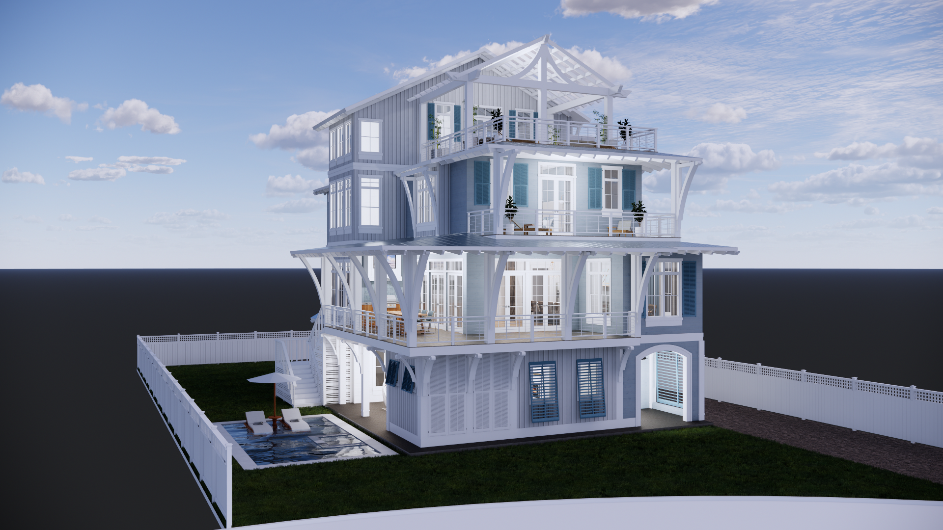 you are a professional image renderer you create the highest grade renderings around and specialize in architectural renderings this is an exterior rendering of a beach house create a high resolution photorealistic image of this home keep the windows as they are where they are keep the doors as they are where they are keep all the structure and detail brackets and shutters as it is where it is feel free to change the perspective keep the ceiling as it is where is it do not add anything to the structure that i have not asked for the setting is a residential beach house neighborhood with views of the beach from the rear and sides of the home