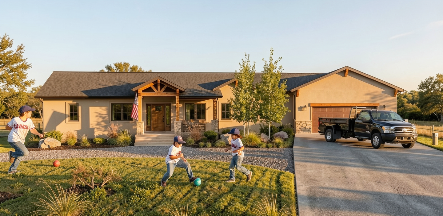 add two boys in jeans with brown hair playing by truck with german short haired pointer dog