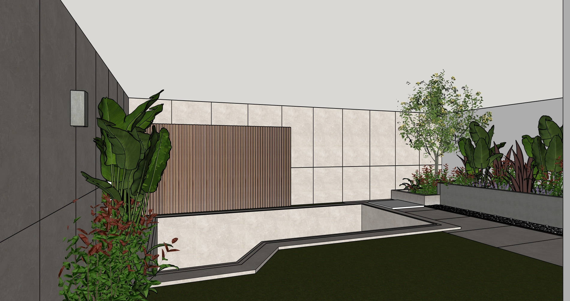 crea una imagen fotorealista a partir de este sketchup es un exterior tenlo en cuenta a ade agua para el hueco de la piscina