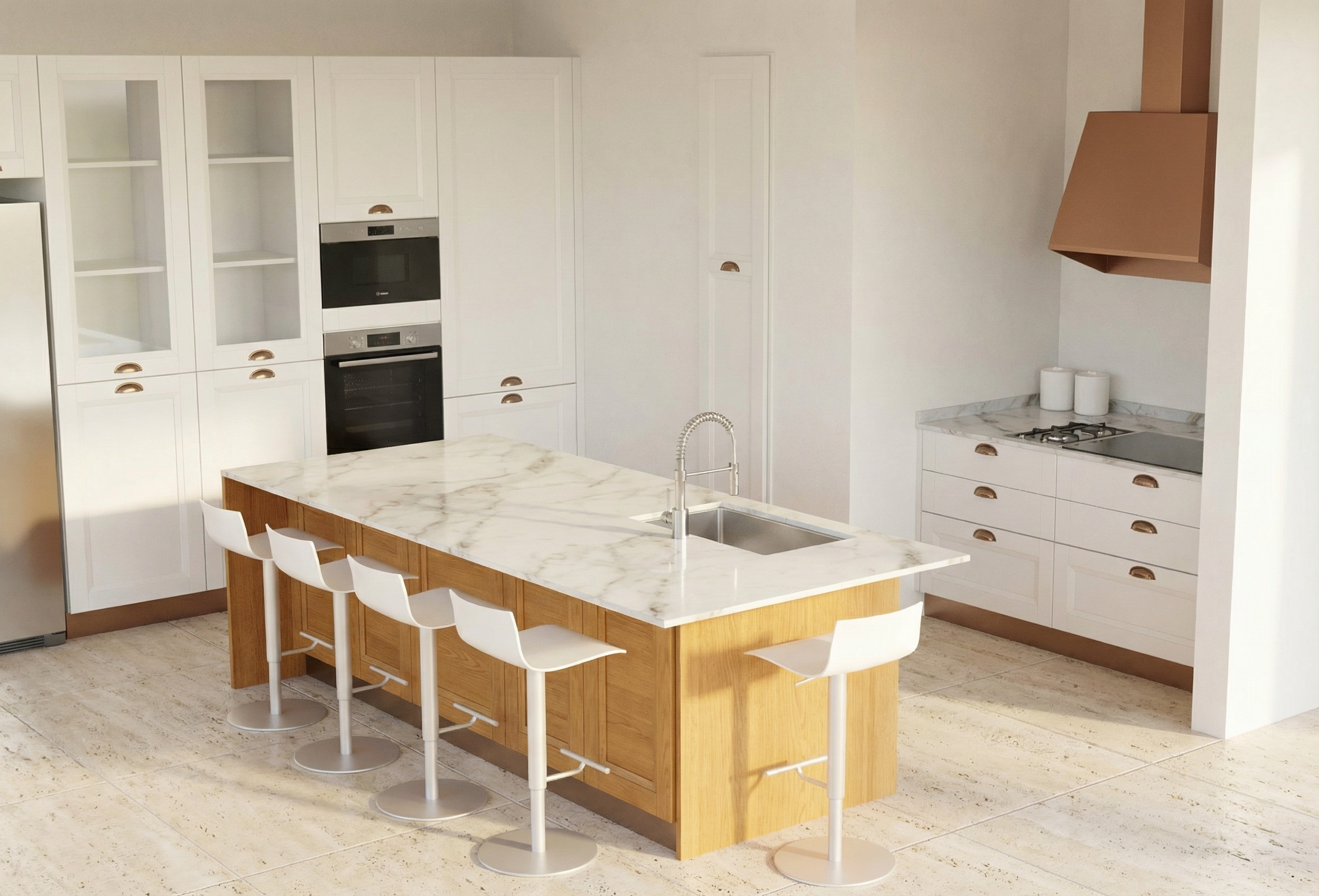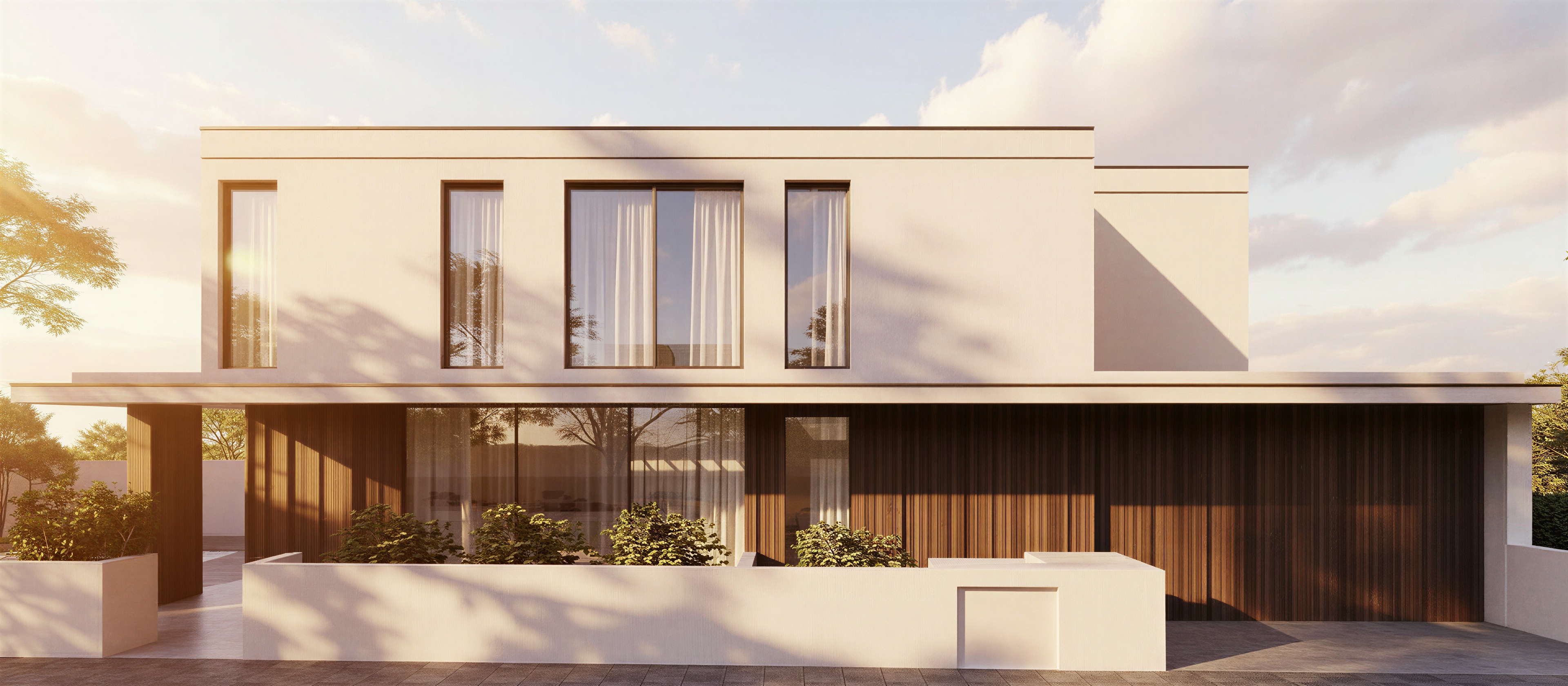 contemporary high end residential architecture inspired by belgian minimalist luxury strong architectural clarity and calm monumental presence sculptural rectilinear volumes with perfect proportions subtle offsets deep reveals and architectural weight no expressive gestures only precise geometry and balance exterior flooring in large format matte natural stone marble honed finish minimal joints seamless indoor outdoor continuity refined craftsmanship tactile and timeless materiality material palette reduced and noble warm off white mineral plaster natural stone dark bronze or blackened aluminum window frames restrained vertical wood elements used sparingly and with purpose landscaping designed as architecture minimal structured and intentional low hedges calm planes of greenery a few sculptural trees gravel or stone beds no decorative planting no excess landscape frames the building quietly soft overcast daylight or muted warm light belgian atmosphere low contrast but high material depth realistic shadows subdued reflections extreme restraint timeless elegance intellectual luxury no trends no ornament no resort feeling no extravagance ultra photorealistic architectural visualization museum level realism tactile surfaces calm and silent luxury