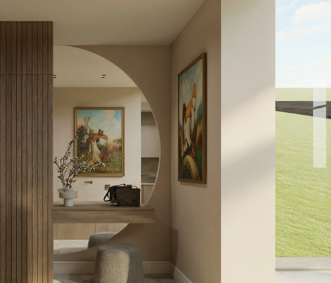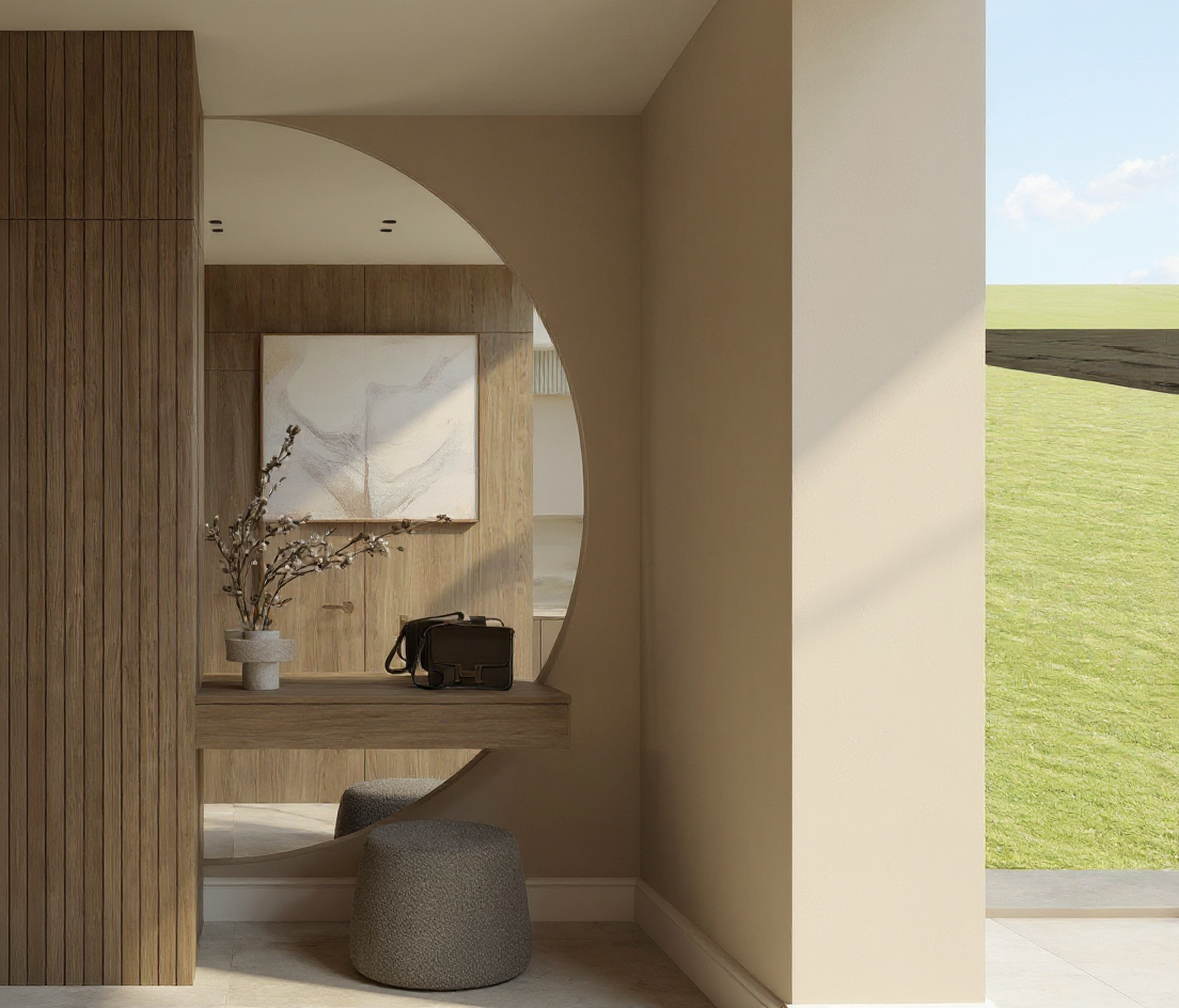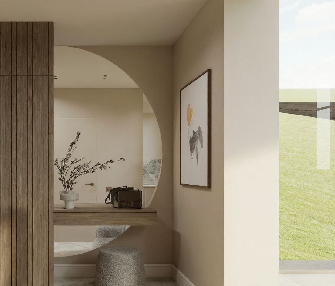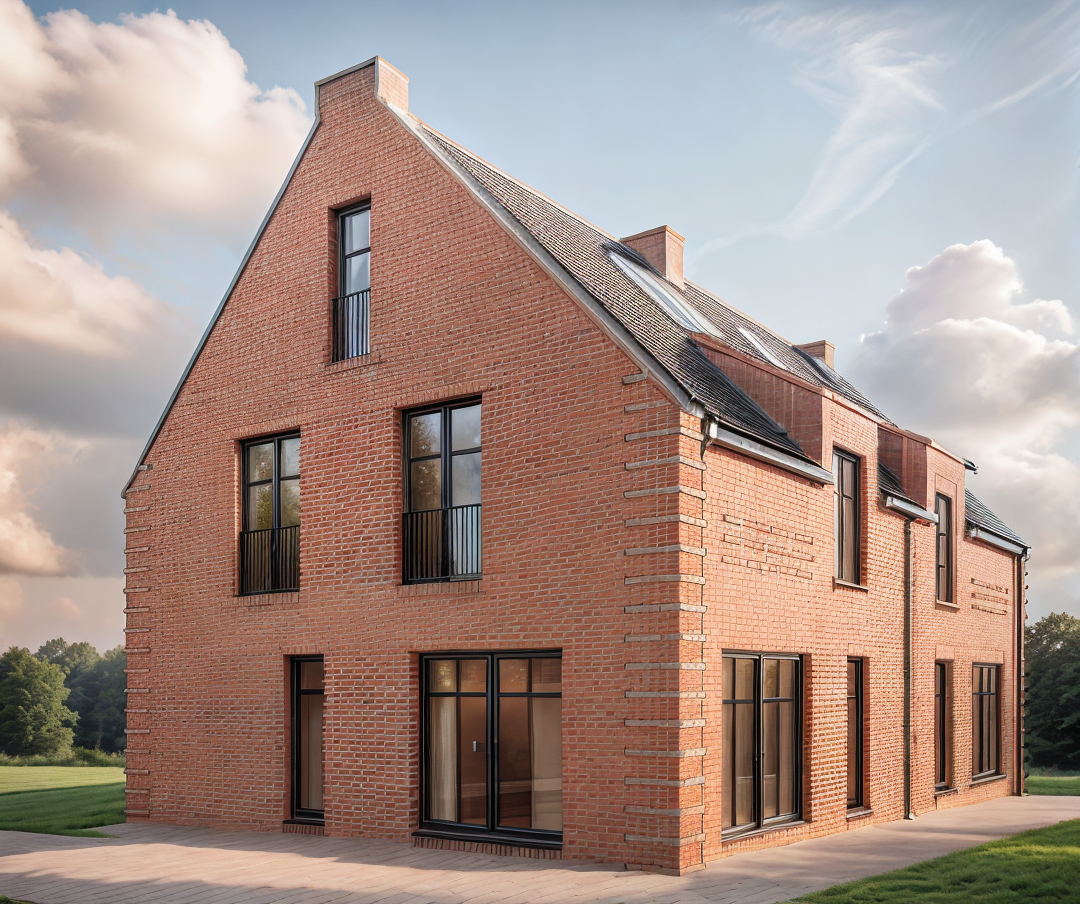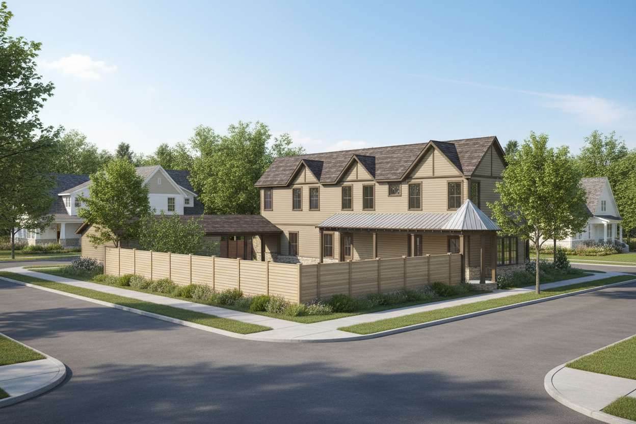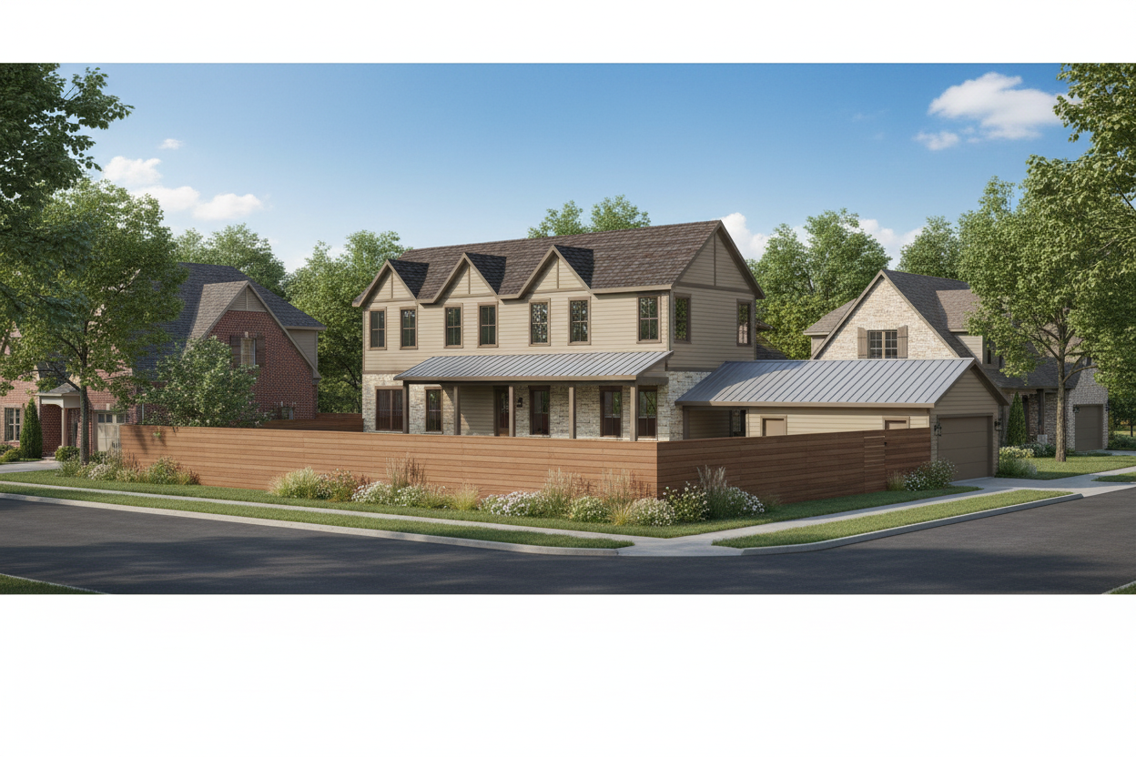 realistic street level rendering of a two story traditional style urban infill home located on a corner lot show both the front street and a side street along the right side of the house include neighboring homes close by to emphasize a city neighborhood setting exterior architecture colors light tan siding darker brown trim on all corners fascias and window frames upper level roof dark brown multi color architectural shingles lower roof sections silver standing seam metal roof porch base light tan stone wainscot windows dark brown frames and mullions site layout detached garage positioned on the right side of the house breezeway connection between garage and main house central courtyard between house and garage includes a small rectangular pool pool area must be visually screened from the main road using a privacy wall or privacy fencing smooth sidewalks along both streets corner lot geometry clearly visible perspective surroundings sunny daytime with soft shadows clean sky include a few trees shrubs and lawn consistent with urban infill landscaping neighboring houses on both streets with similar scale and massing to reinforce context overall style warm welcoming curb appeal balanced traditional elevation with craftsman influences