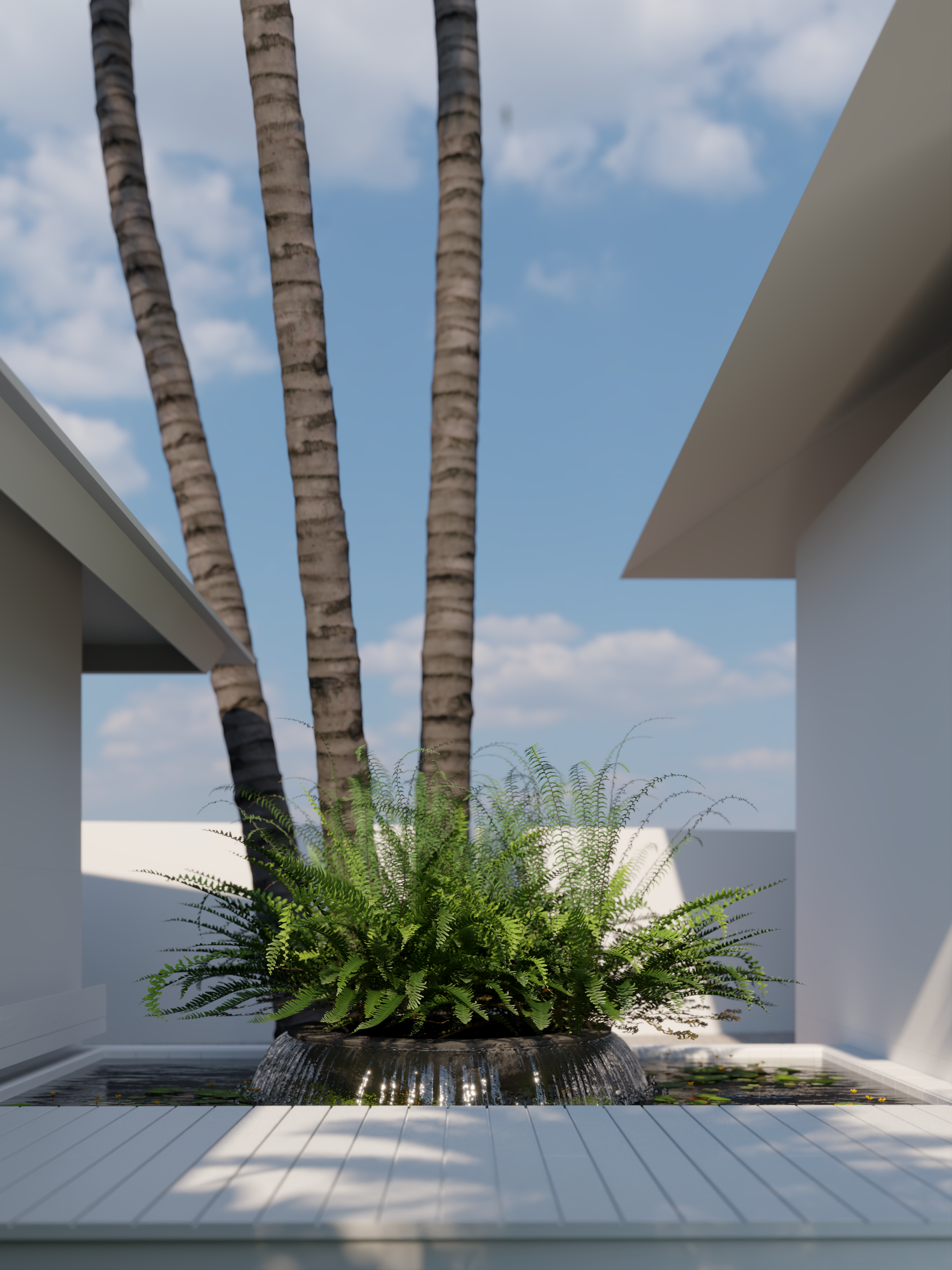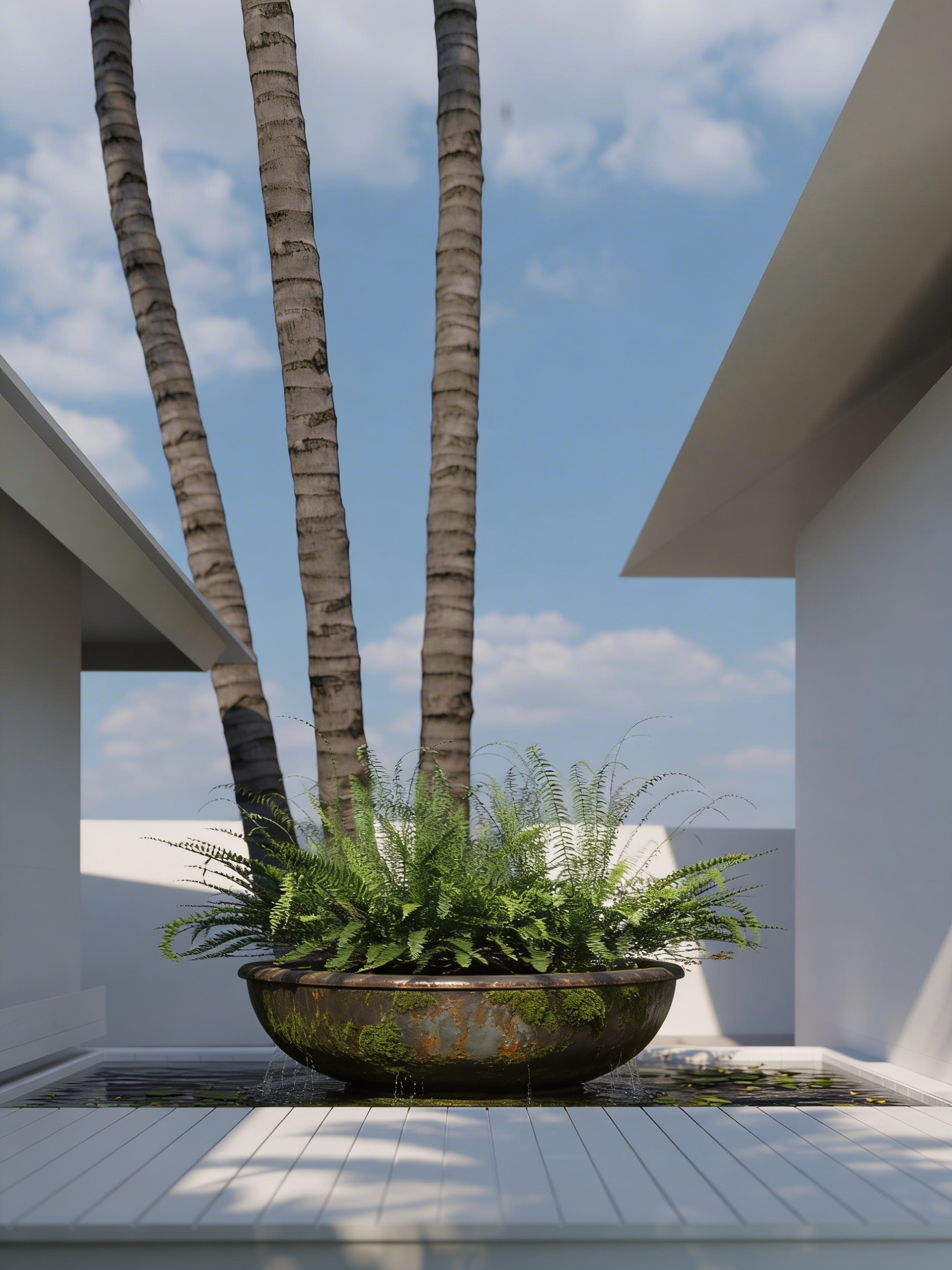 make the fountain bowl more photo realistic and natural with moss and antique color arrange the place of the fountain bowl to be more aesthetic and minimalist remove the plantation on the top of the bowl water flows out from the bowl
