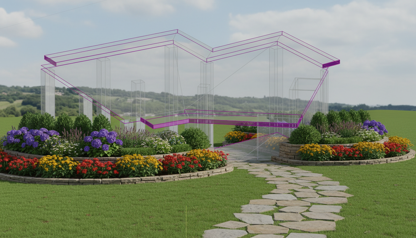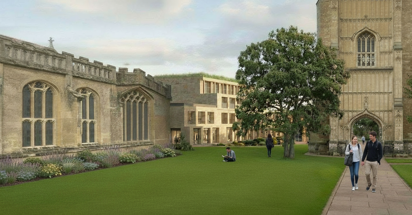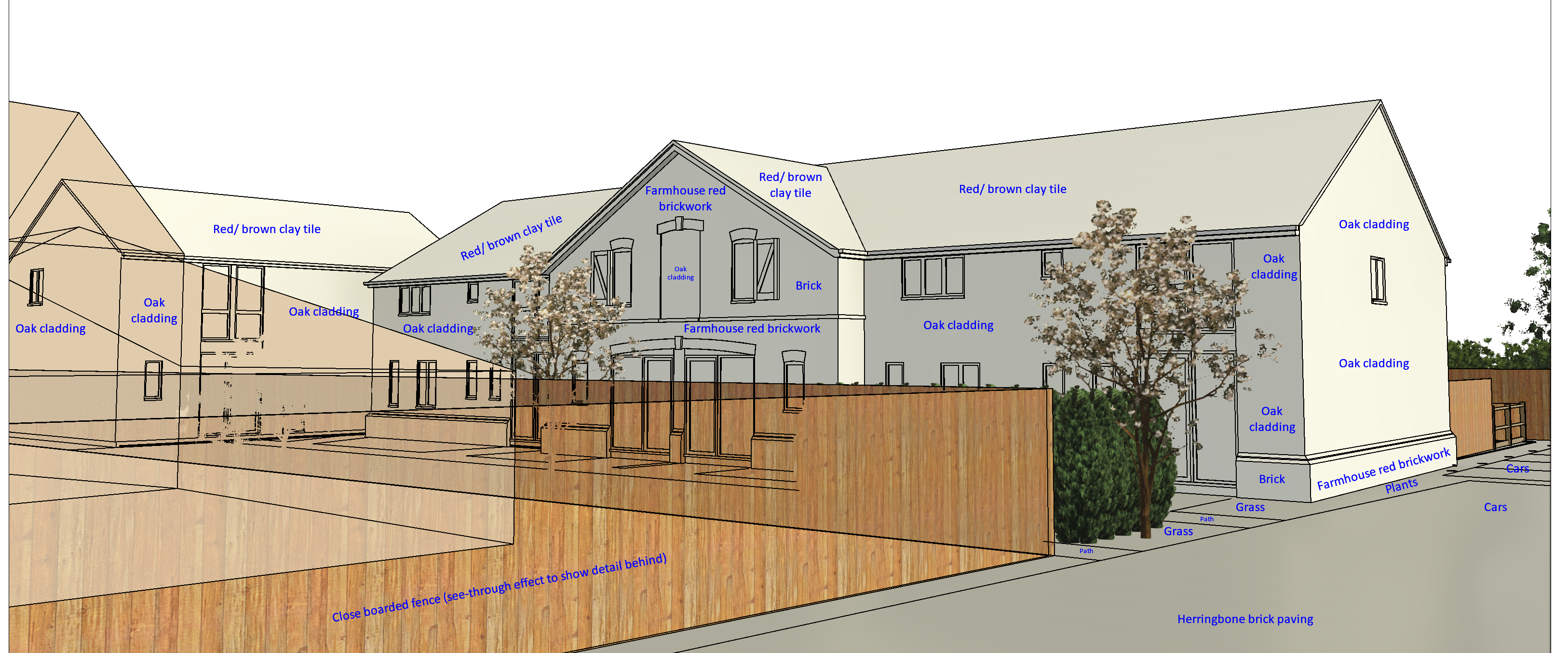 please create a realistic render of these buildings there is a farmhouse red brick plinth around the base of the walls with horizontal oak cladding above the plinth the central gable of the large main building is all brickwork with oak cladding in the central first floor dummy opening all window and door frames are black aluminium the shutters on the central first floor windows are black timber the driveway forecourt is herringbon brickwork and should have a couple of cars in the spaces there should be paths to the doors with grass and planting infront of the building and around the parking bays the fencing and beige buildings in the foreground should have a see thorugh effect that shows they are there but allows you to see the detail of the buildings behind