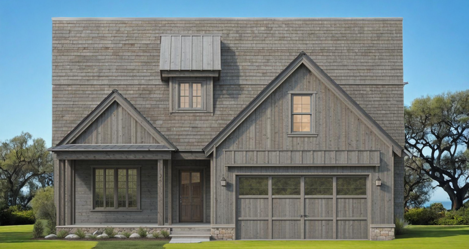 dark shingle roofing on main lighter grey siding all white trim white windows white columns on front porch architecture