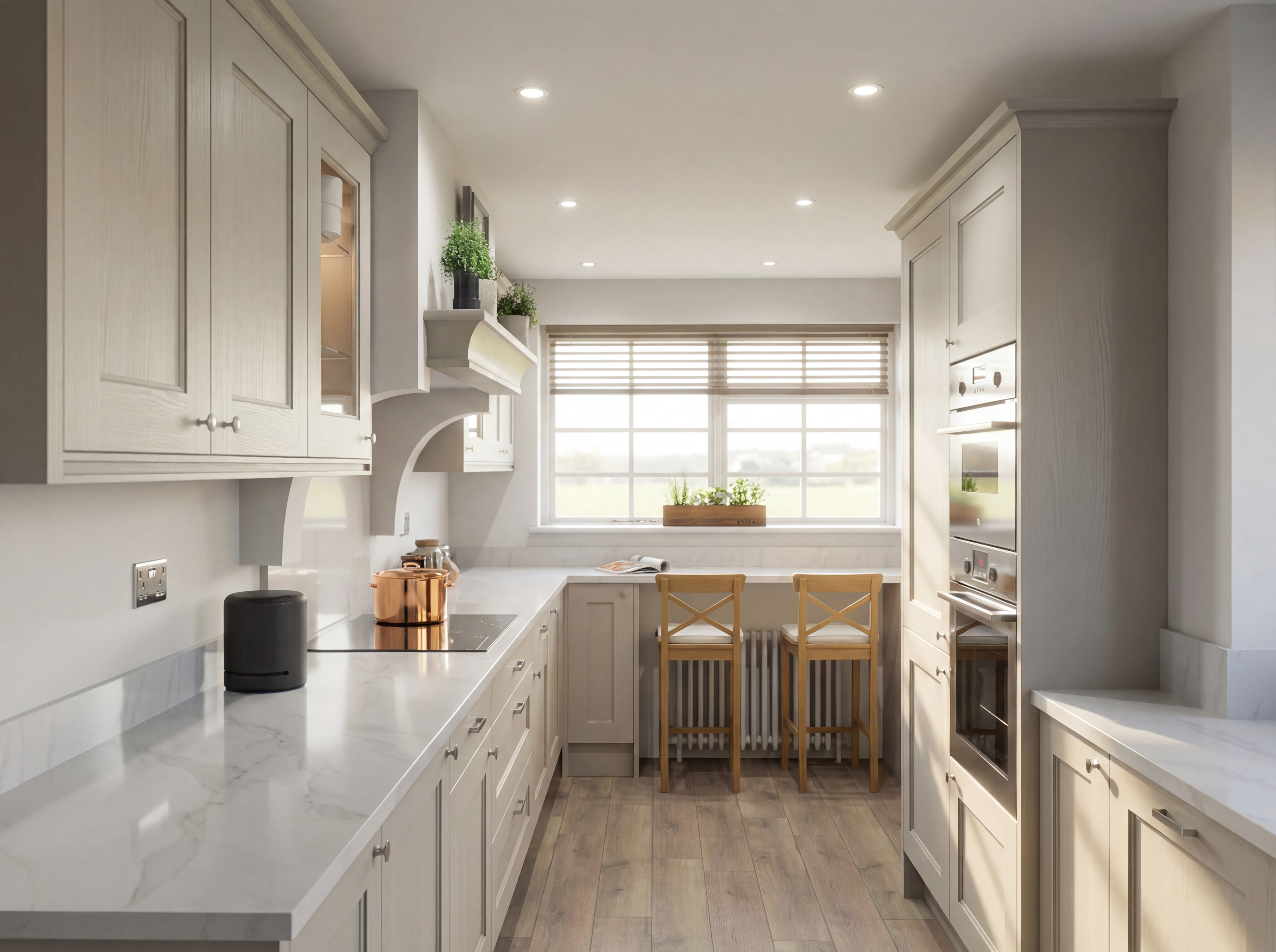 convert this floor plan into a realistic isometric 3d view of a full house show the space from an elevated angle with furniture walls and details visible modern furniture and material tile in bathrooms laminate flooring bedrooms and kitchen concrete garage floor concrete pavers outside the house use the same furniture as shows on the plan do not change the orientation of the floorplan