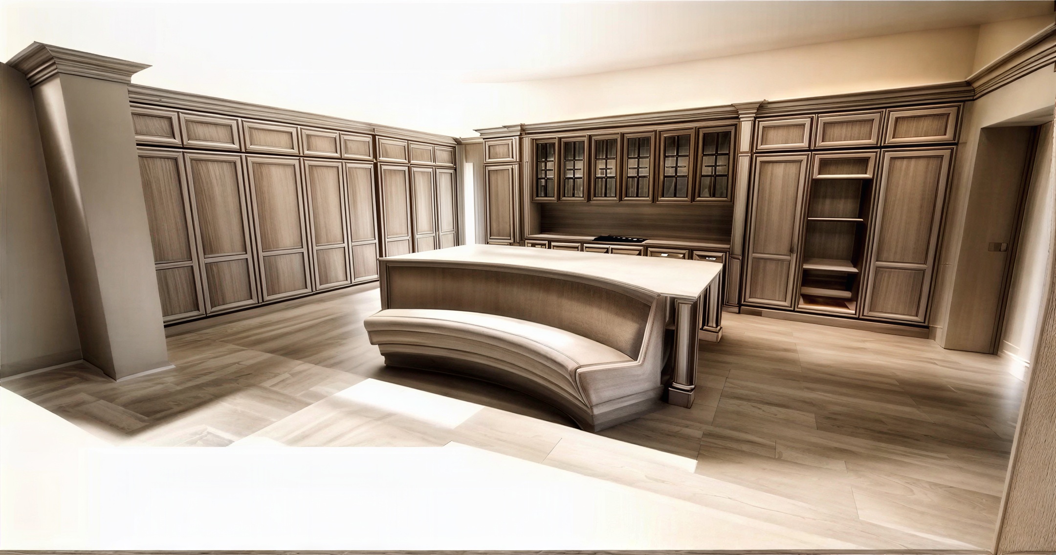 interior shot create a beautifully rendered kitchen interior featuring elegant cabinetry and a curved island use a sophisticated color palette soft cream for the cabinets a warm light oak for the countertops and a muted sage green for the walls the floor should be a polished marble in light gray tones incorporate warm ambient lighting from under cabinet and ceiling fixtures creating a cozy inviting atmosphere add subtle reflections and realistic shadows to enhance the depth and texture