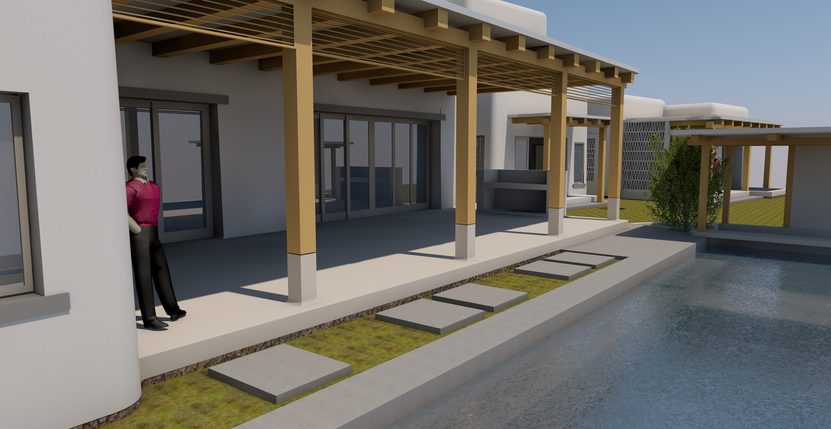 sunrise to left beach view moody lighting screed flooring bushy garden to the right no wood light beige terrazzo floor